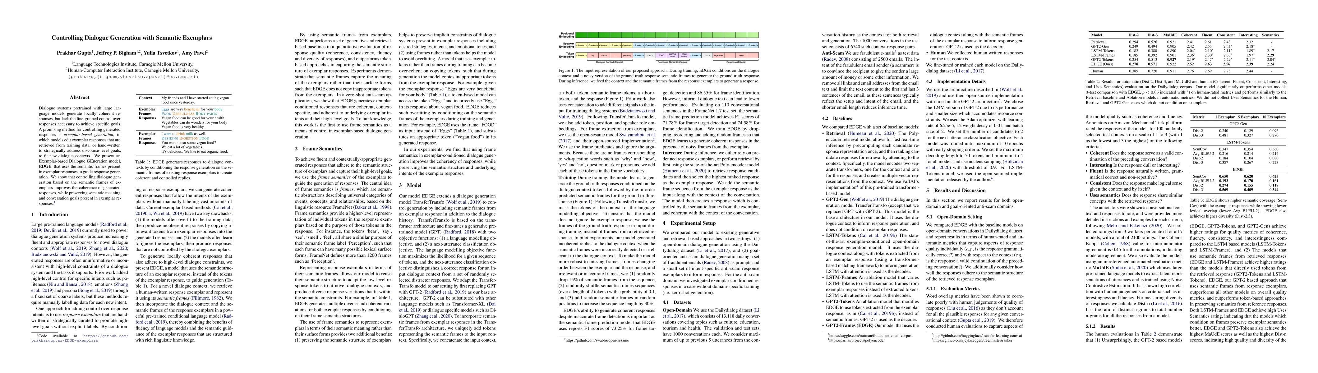 The paper proposes EDGE, an Exemplar-based Dialogue Generation model that leverages semantic frames from exemplar responses to guide dialogue generation, improving coherence while maintaining semantic meaning and conversation goals. This approach reduces excessive word copying from exemplars, enhancing the relevance and fluency of generated dialogue.