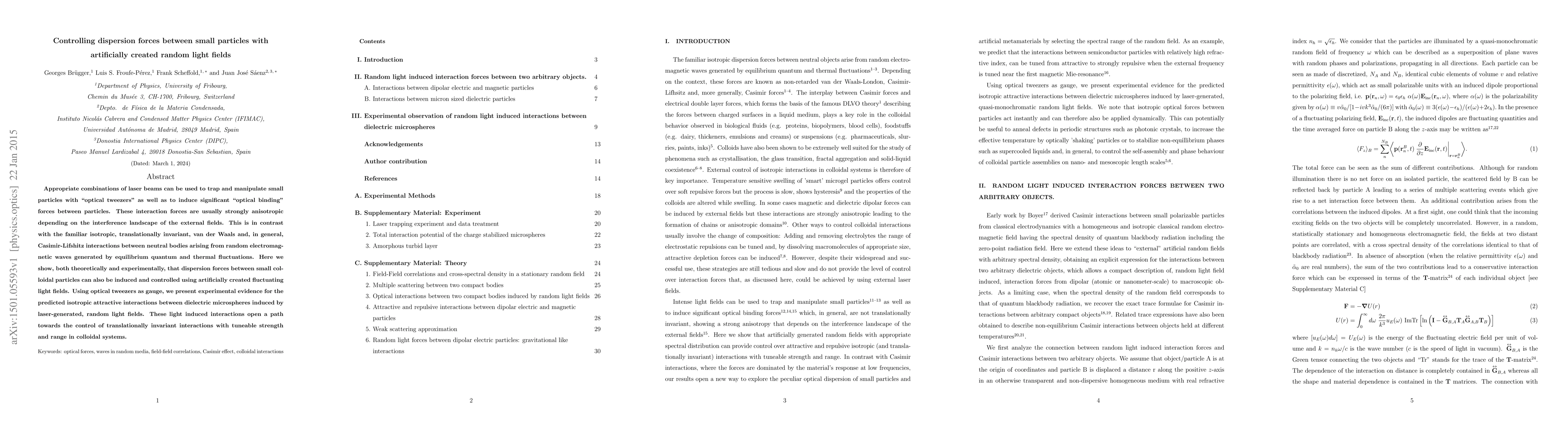 This paper demonstrates both theoretically and experimentally that dispersion forces between small colloidal particles can be controlled using artificially created fluctuating light fields. The study shows that laser-generated random light fields can induce isotropic attractive interactions between dielectric microspheres, offering a new method to manipulate translationally invariant interactions in colloidal systems.
