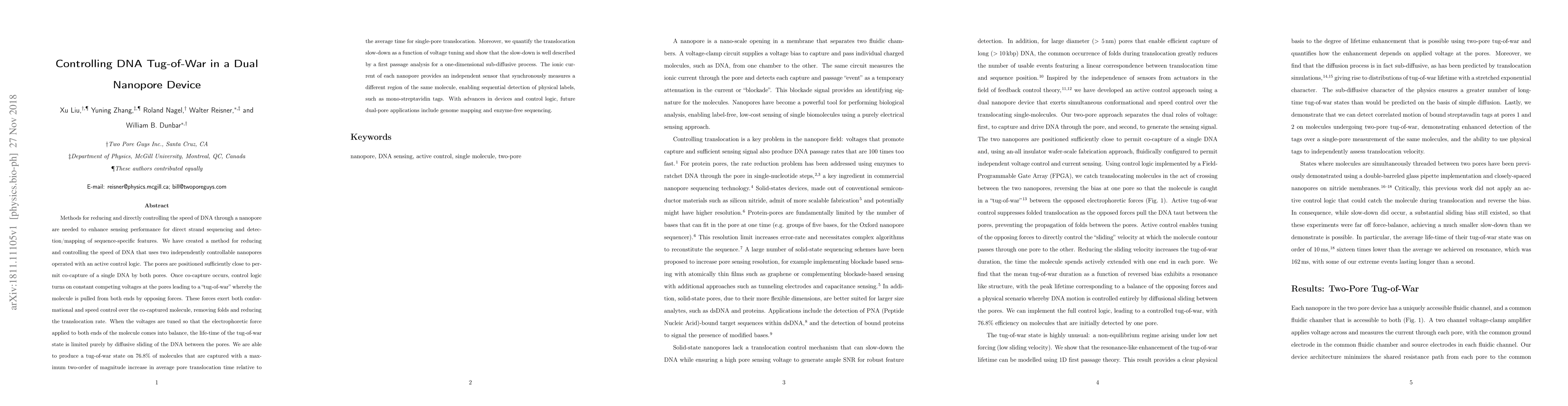 Methods for reducing and directly controlling the speed of DNA through a nanopore are needed to enhance sensing performance for direct strand sequencing and detection/mapping of sequence-specific features. We have created a method for reducing and controlling the speed of DNA that uses two independently controllable nanopores operated with an active control logic. The pores are positioned sufficiently close to permit co-capture of a single DNA by both pores. Once co-capture occurs, control logic turns on constant competing voltages at the pores leading to a `tug-of-war' whereby the molecule is pulled from both ends by opposing forces. These forces exert both conformational and speed control over the co-captured molecule, removing folds and reducing the translocation rate. When the voltages are tuned so that the electrophoretic force applied to both ends of the molecule comes into balance, the life-time of the tug-of-war state is limited purely by diffusive sliding of the DNA between the pores. We are able to produce a tug-of-war state on 76.8% of molecules that are captured with a maximum two-order of magnitude increase in average pore translocation time relative to the average time for single-pore translocation. Moreover, we quantify the translocation slow-down as a function of voltage tuning and show that the slow-down is well described by a first passage analysis for a one-dimensional sub-diffusive process. The ionic current of each nanopore provides an independent sensor that synchronously measures a different region of the same molecule, enabling sequential detection of physical labels, such as mono-streptavidin tags. With advances in devices and control logic, future dual-pore applications include genome mapping and enzyme-free sequencing.