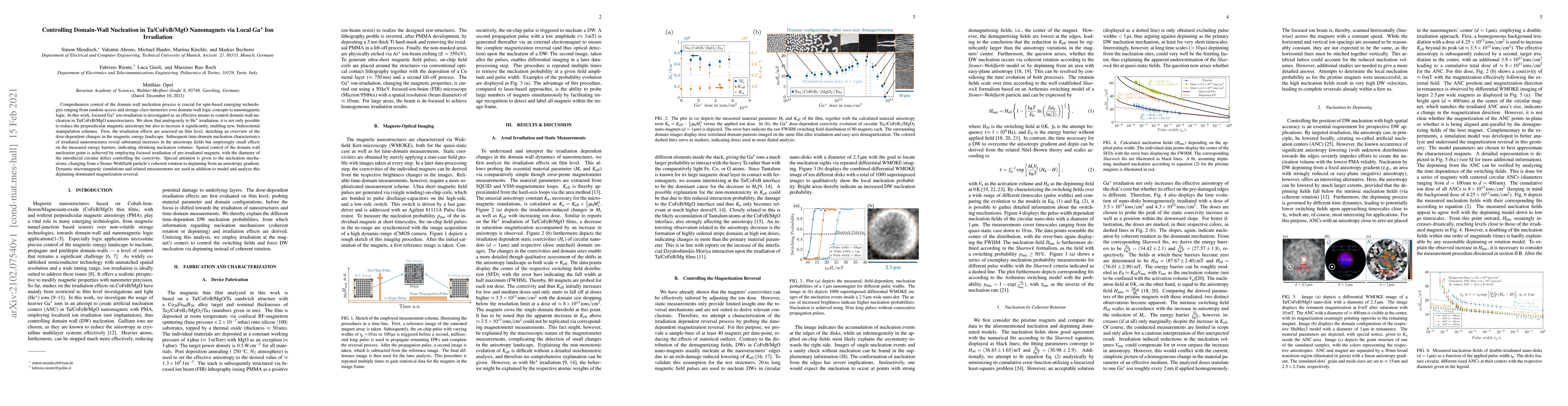 This paper investigates focused Ga+ ion irradiation as a method to control domain-wall nucleation in Ta/CoFeB/MgO nanomagnets, demonstrating significant changes in perpendicular magnetic anisotropy and enabling new manipulation schemes. The study reveals that irradiation can increase anisotropy fields and shrink nucleation volumes, with spatial control achieved through focused irradiation, altering nucleation mechanisms.