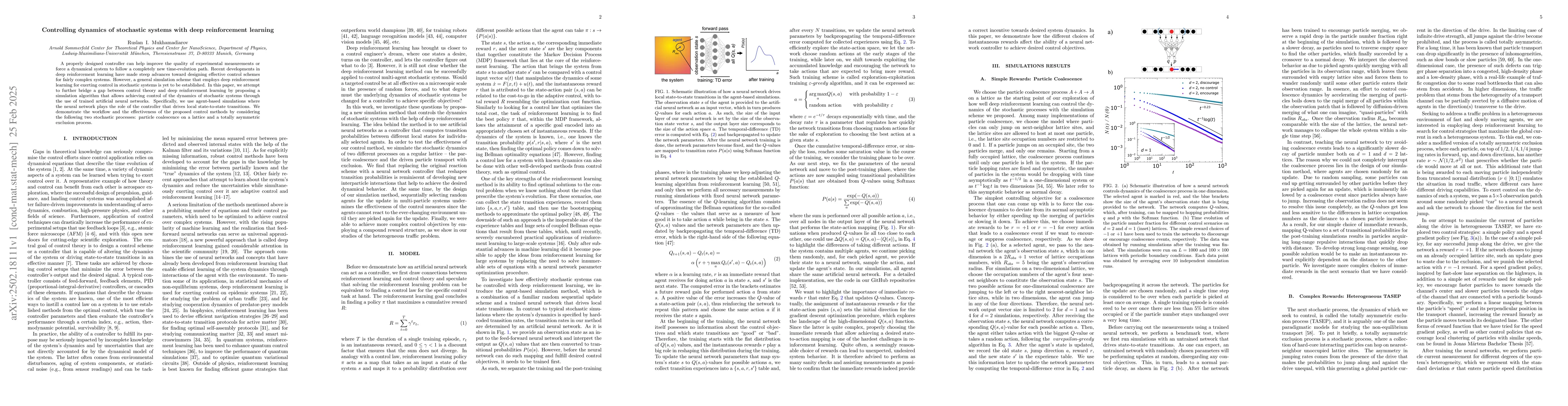 This paper proposes a simulation algorithm using deep reinforcement learning to control the dynamics of stochastic systems, employing neural networks as controllers in agent-based simulations. The effectiveness is demonstrated through particle coalescence on a lattice and a totally asymmetric exclusion process.