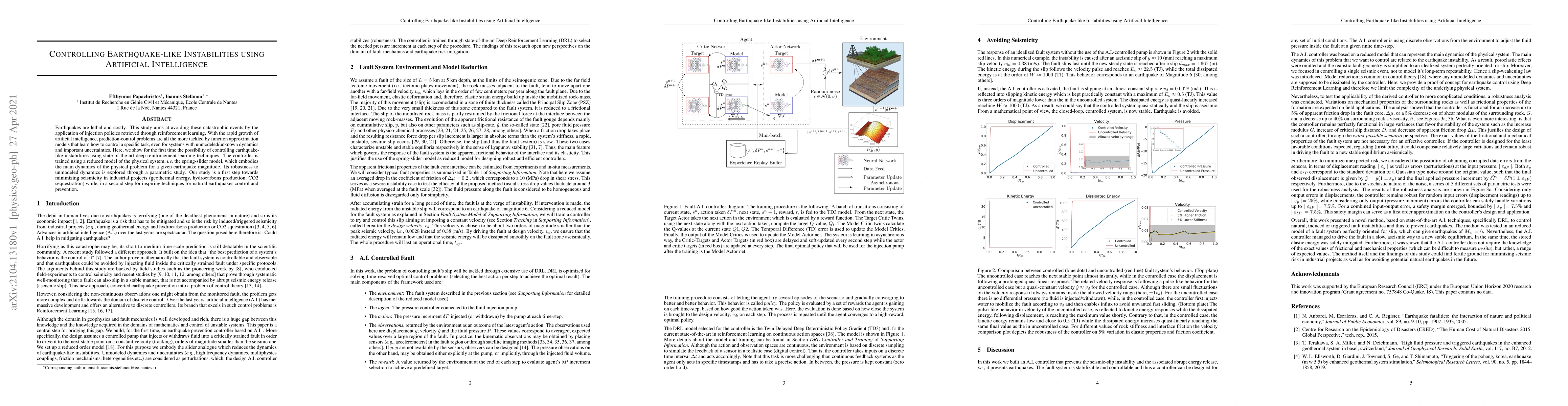 This study explores the use of deep reinforcement learning to control earthquake-like instabilities, demonstrating the potential of AI-driven injection policies to mitigate catastrophic events. The approach trains a controller on a spring-slider model, showcasing its robustness and potential for minimizing seismicity in industrial applications.