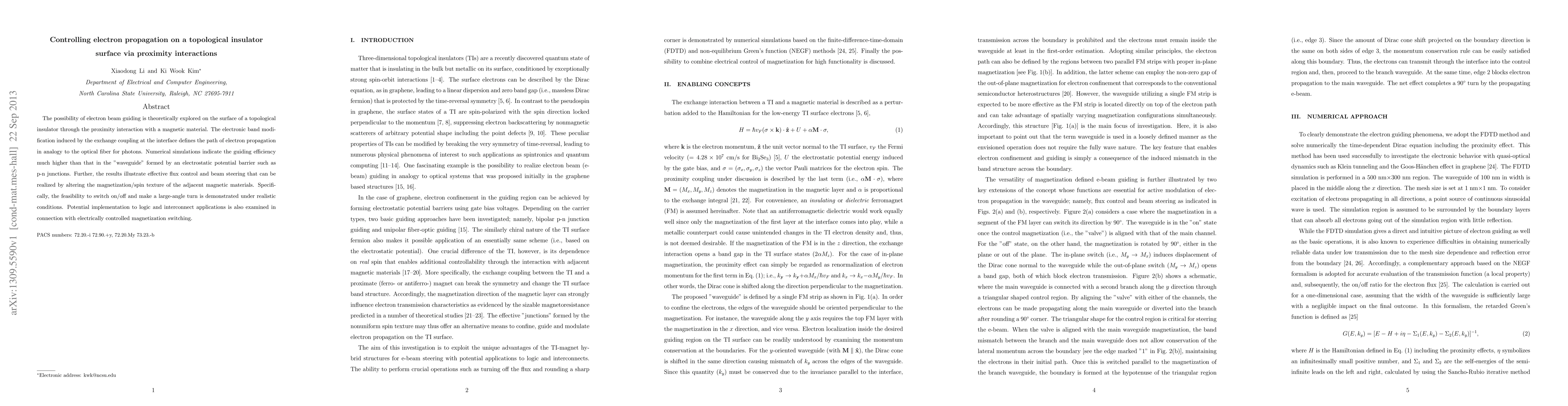 The possibility of electron beam guiding is theoretically explored on the surface of a topological insulator through the proximity interaction with a magnetic material. The electronic band modification induced by the exchange coupling at the interface defines the path of electron propagation in analogy to the optical fiber for photons. Numerical simulations indicate the guiding efficiency much higher than that in the "waveguide" formed by an electrostatic potential barrier such as p-n junctions. Further, the results illustrate effective flux control and beam steering that can be realized by altering the magnetization/spin texture of the adjacent magnetic materials. Specifically, the feasibility to switch on/off and make a large-angle turn is demonstrated under realistic conditions. Potential implementation to logic and interconnect applications is also examined in connection with electrically controlled magnetization switching.