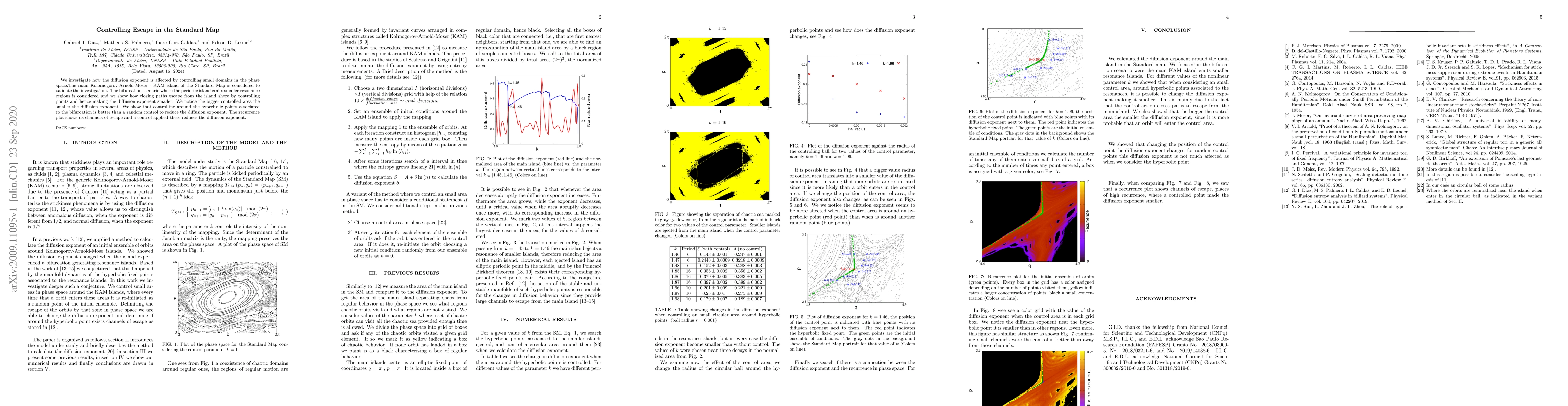 This paper examines how controlling specific small domains in the phase space of the Standard Map can reduce the diffusion exponent, thereby minimizing chaotic escape. It finds that focusing control around hyperbolic points associated with bifurcations is more effective than random control, leading to smaller diffusion exponents.