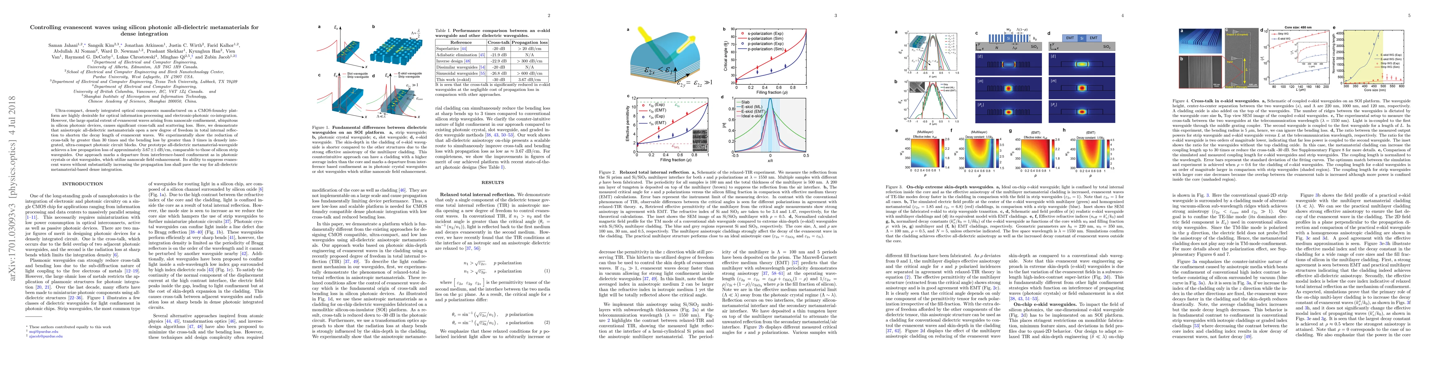 This paper demonstrates the use of anisotropic all-dielectric metamaterials to control evanescent waves in silicon photonic devices, significantly reducing cross-talk and bending loss. The approach achieves a low propagation loss of approximately 3.7 dB/cm, paving the way for dense integration in optical information processing.