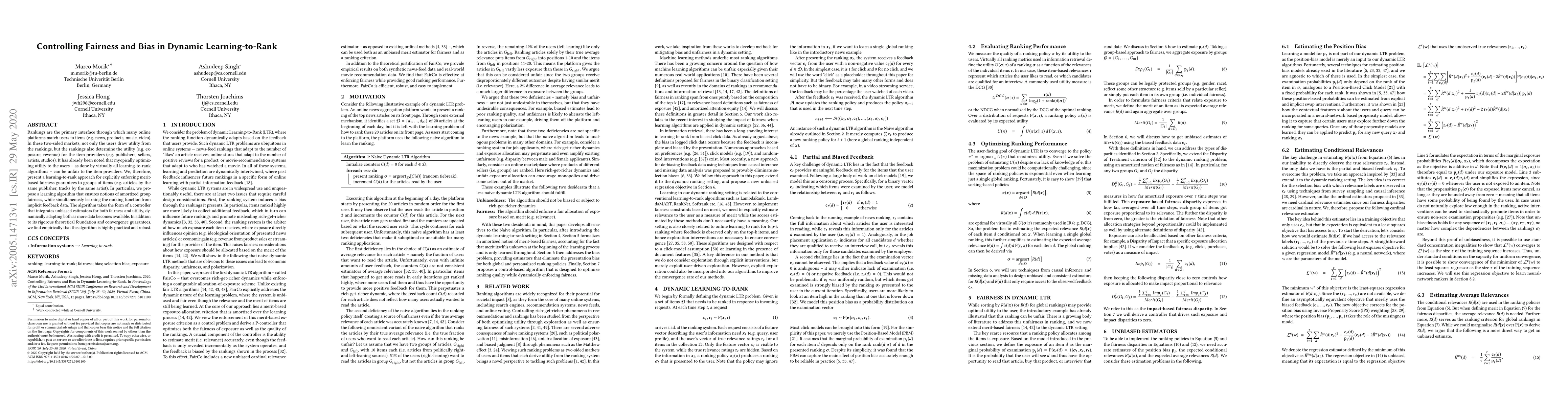 Rankings are the primary interface through which many online platforms match users to items (e.g. news, products, music, video). In these two-sided markets, not only the users draw utility from the rankings, but the rankings also determine the utility (e.g. exposure, revenue) for the item providers (e.g. publishers, sellers, artists, studios). It has already been noted that myopically optimizing utility to the users, as done by virtually all learning-to-rank algorithms, can be unfair to the item providers. We, therefore, present a learning-to-rank approach for explicitly enforcing merit-based fairness guarantees to groups of items (e.g. articles by the same publisher, tracks by the same artist). In particular, we propose a learning algorithm that ensures notions of amortized group fairness, while simultaneously learning the ranking function from implicit feedback data. The algorithm takes the form of a controller that integrates unbiased estimators for both fairness and utility, dynamically adapting both as more data becomes available. In addition to its rigorous theoretical foundation and convergence guarantees, we find empirically that the algorithm is highly practical and robust.
