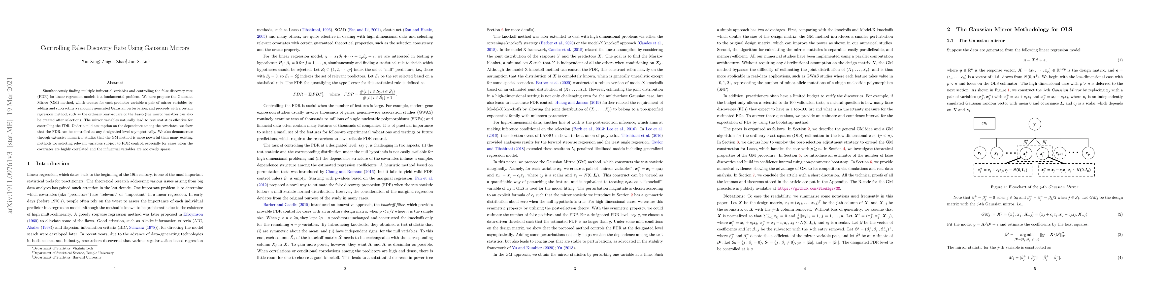 The Gaussian Mirror (GM) method introduces mirror variables to linear regression models to effectively control the false discovery rate (FDR) while identifying influential predictors. It demonstrates superior performance over existing methods, especially for highly correlated covariates and non-sparse influential variables.