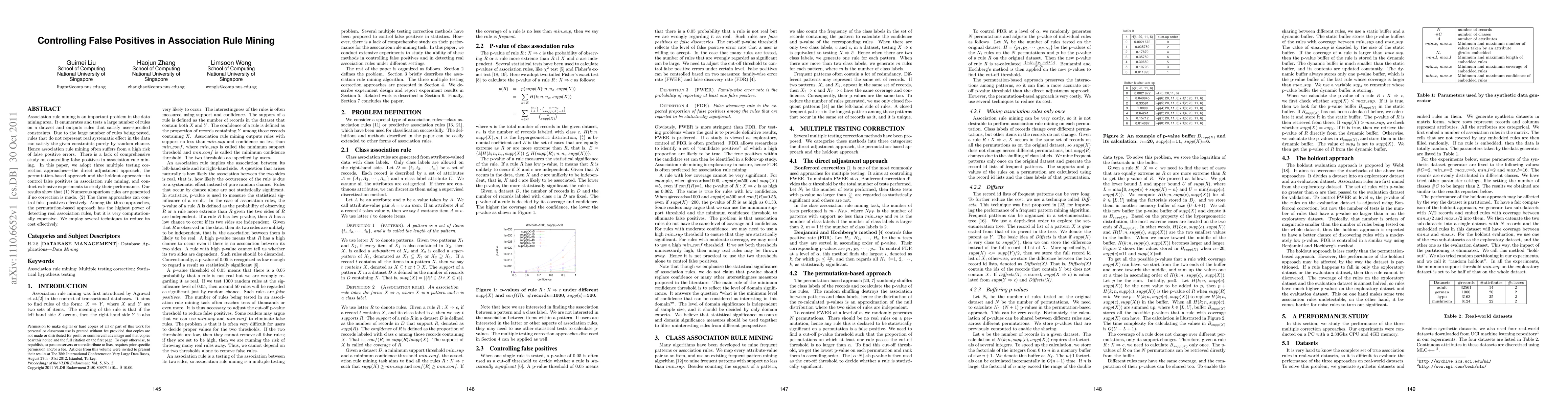 This paper investigates methods to control false positives in association rule mining, employing three correction techniques: direct adjustment, permutation-based, and holdout approaches. Results indicate that without correction, spurious rules proliferate, while the tested methods effectively mitigate false positives, with the permutation-based approach offering the best detection power albeit at a high computational cost.