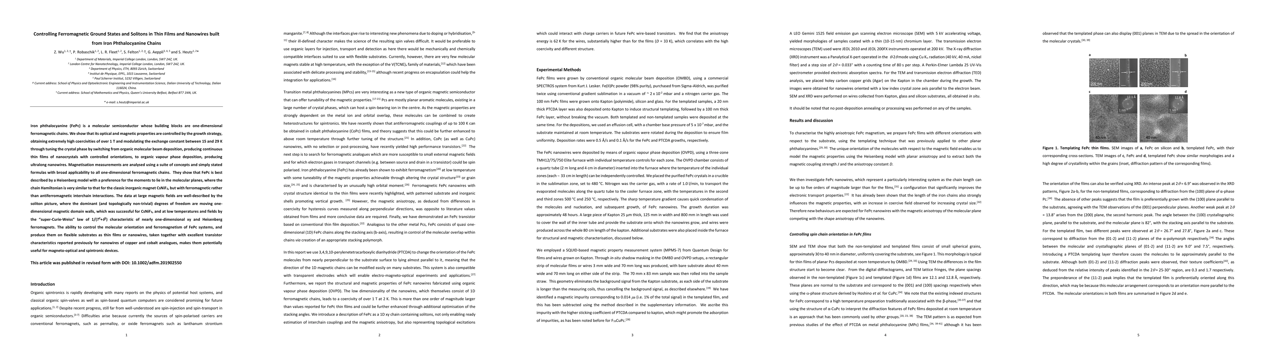 This paper demonstrates control over the ferromagnetic ground states and solitons in thin films and nanowires of iron phthalocyanine (FePc) by varying the growth method, achieving high coercivities and tunable exchange constants. The study reveals FePc's suitability for magneto-optical and spintronic applications due to its magnetic properties and flexibility.