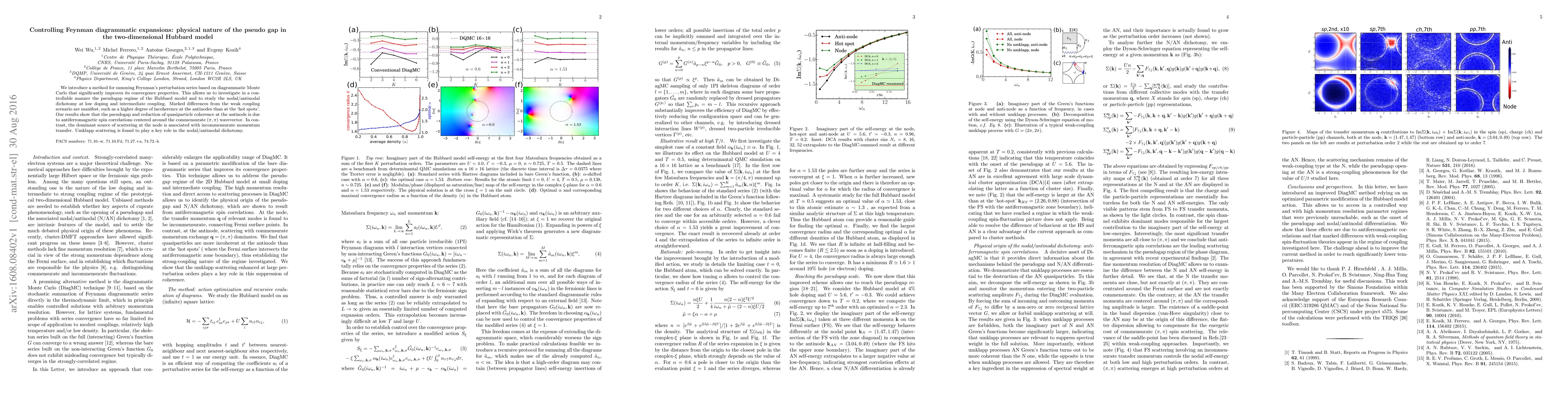 This paper presents a novel method for summing Feynman diagrams using diagrammatic Monte Carlo, which enhances the convergence of perturbation series. The study reveals significant differences in the pseudogap regime of the two-dimensional Hubbard model, showing higher incoherence at antinodes due to antiferromagnetic spin correlations, while incommensurate momentum transfer dominates scattering at nodes, with Umklapp scattering crucial for the nodal/antinodal dichotomy.