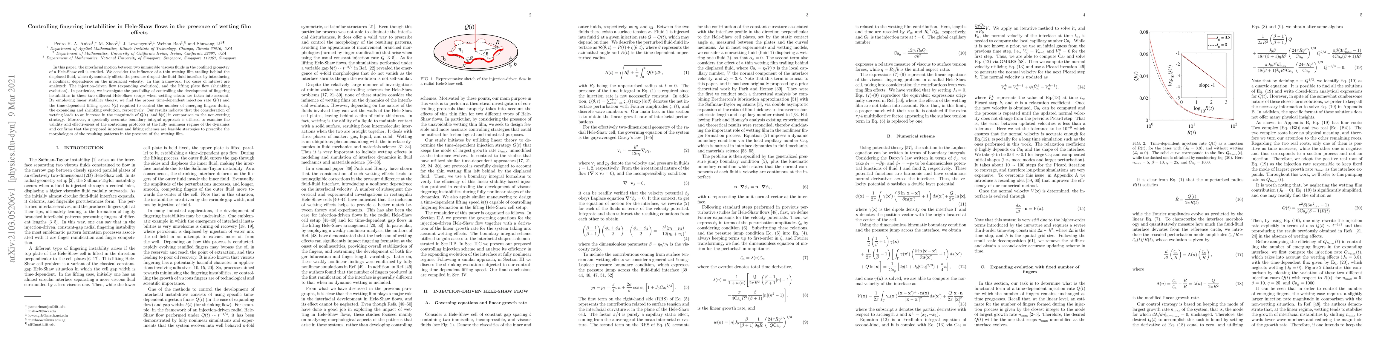 The paper presents a comprehensive framework for controlling fingering instabilities in Hele-Shaw flows considering wetting film effects, combining linear stability theory with numerical simulations.