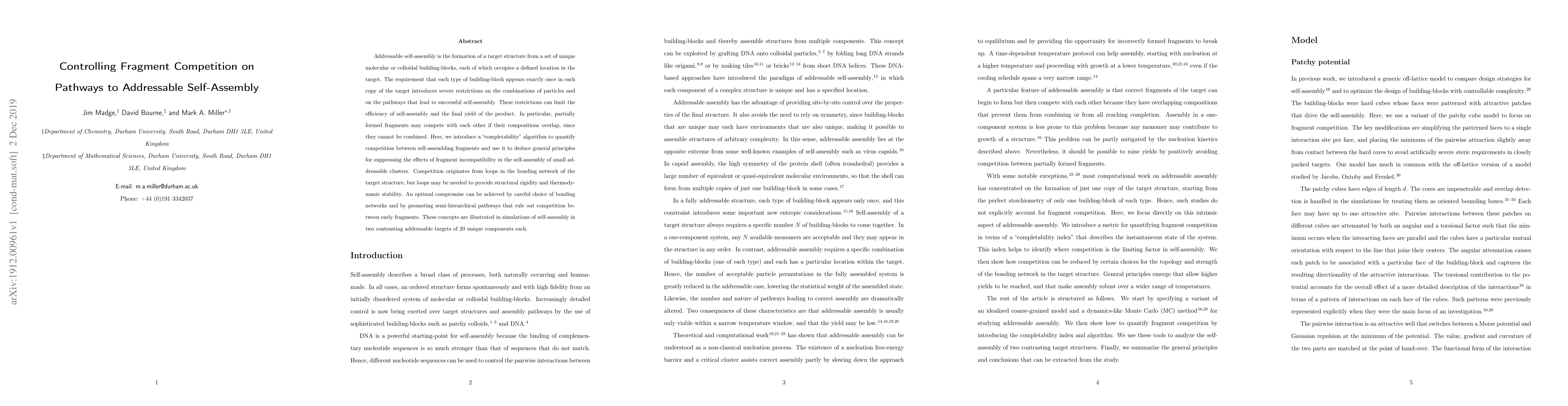 This research introduces a "completability" algorithm to manage competition between self-assembling fragments in addressable self-assembly, proposing strategies to suppress fragment incompatibility through semi-hierarchical pathways and optimal bonding networks. Simulations demonstrate these principles in the assembly of two distinct targets composed of 20 unique components.