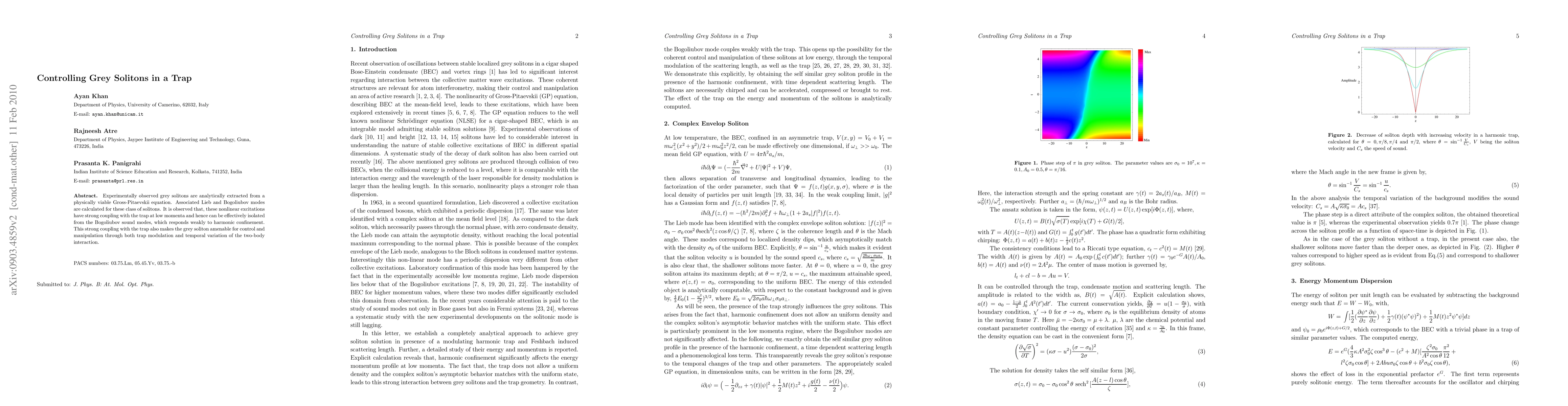 Experimentally observed grey solitons are analytically extracted from a physically viable \GP equation. Associated Lieb and Bogoliubov modes are calculated for these class of solitons. It is observed that, these nonlinear excitations have strong coupling with the trap at low momenta and hence can be effectively isolated from the Bogoliubov sound modes, which responds weakly to harmonic confinement. This strong coupling with the trap also makes the grey soliton amenable for control and manipulation through both trap modulation and temporal variation of the two-body interaction.