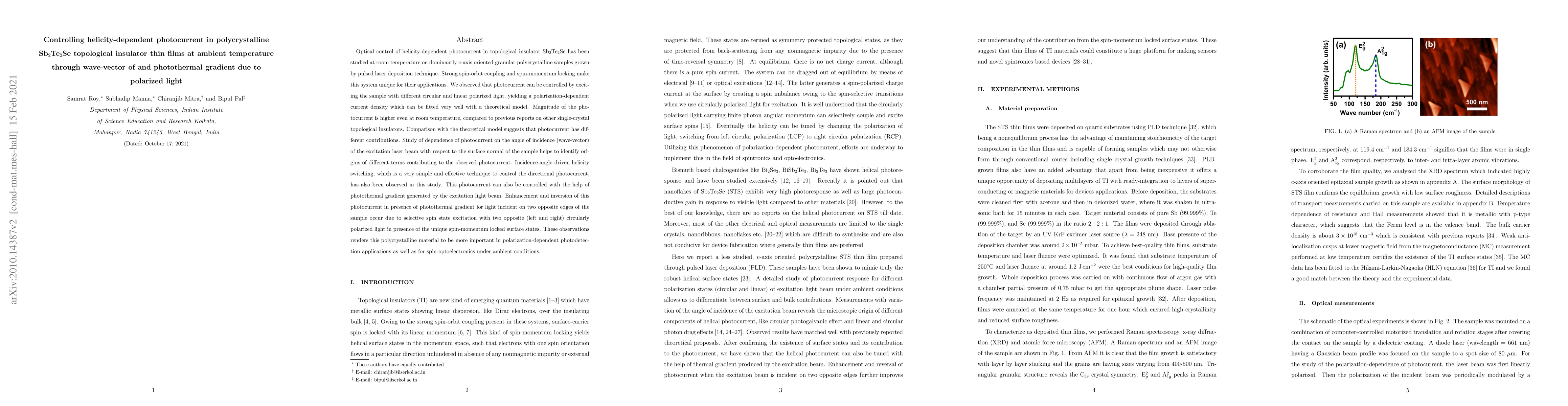 The research demonstrates controlling helicity-dependent photocurrent in a polycrystalline Sb$_2$Te$_2$Se topological insulator at room temperature via polarized light and photothermal gradient. Key findings include polarization-dependent current density, higher photocurrent magnitude compared to single-crystal counterparts, and control through wave-vector of incident light and photothermal effects. This suggests potential for ambient-condition polarization-dependent photodetection and spin-optoelectronics applications.