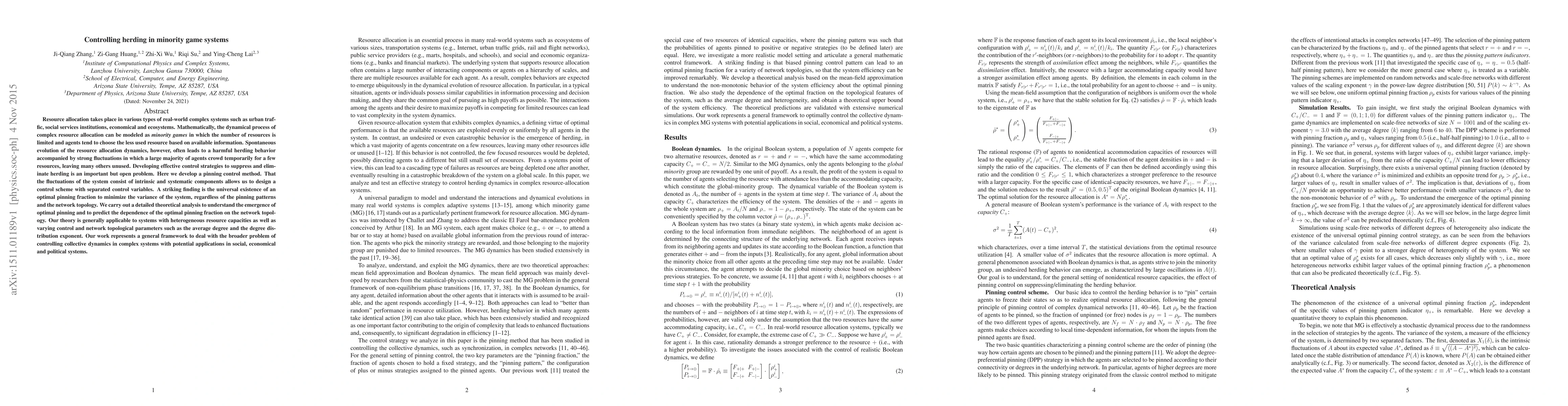 This paper develops a pinning control strategy to mitigate herding behavior in minority game systems, where resource allocation leads to fluctuations and inefficient use of resources. The authors find an optimal pinning fraction that universally minimizes system variance, applicable to various network topologies and resource capacities, offering a general framework for controlling collective dynamics in complex systems.