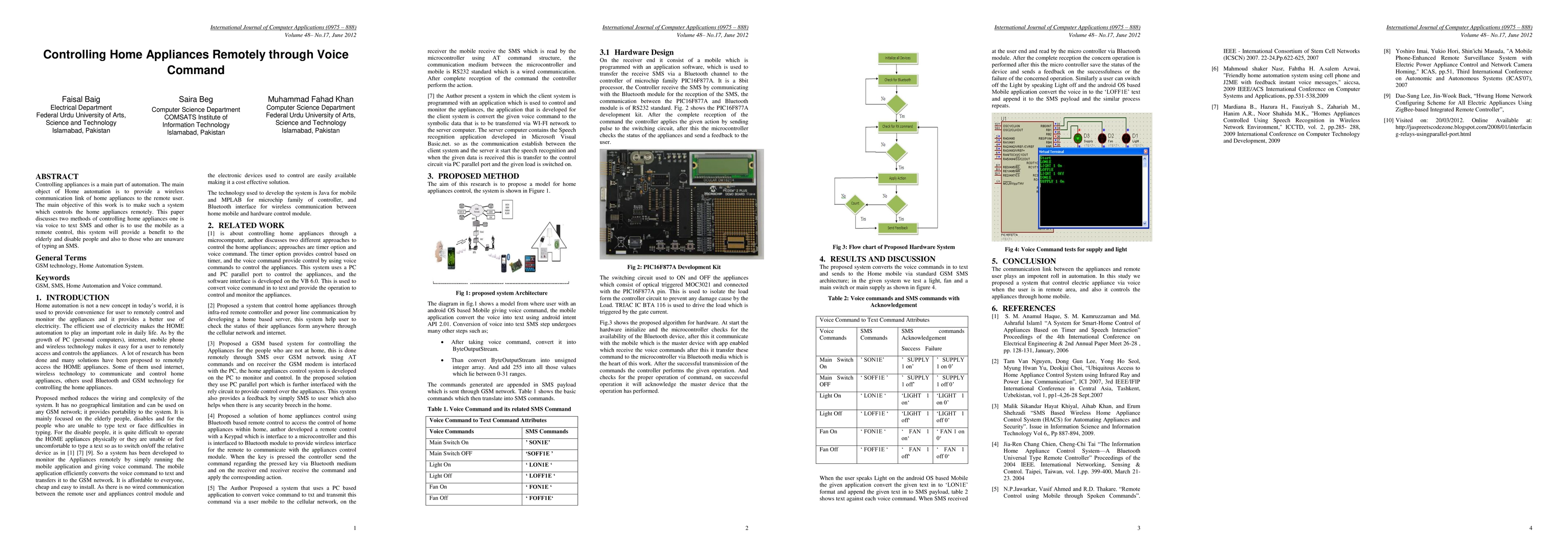 Summary: This paper explores two methods for remotely controlling home appliances: voice-to-text SMS and mobile remote control. The system aims to benefit the elderly, disabled, and those unfamiliar with SMS, enhancing automation and accessibility in home environments.