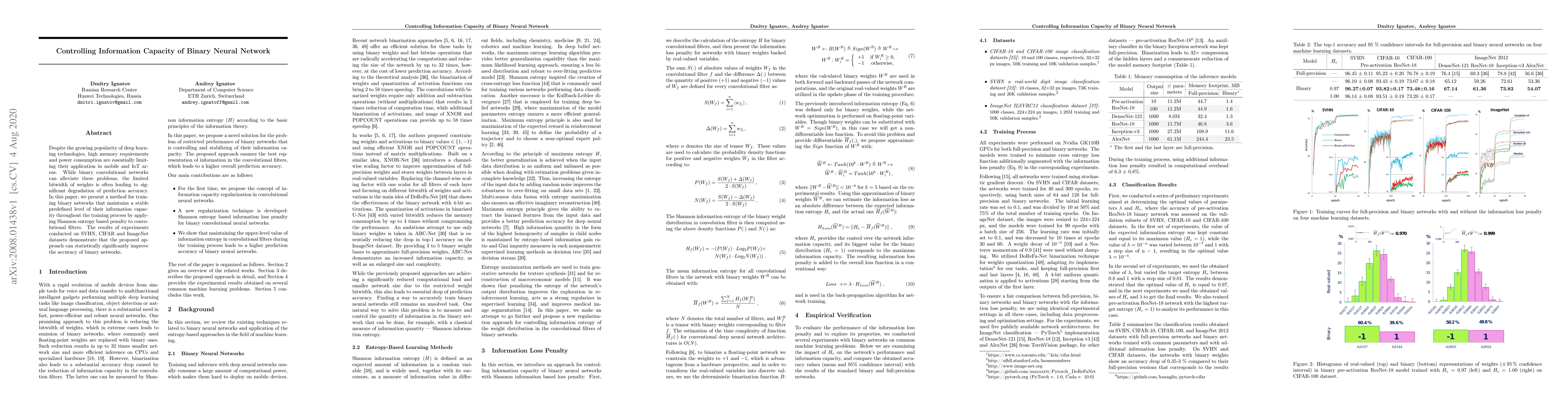 This paper proposes a method to train binary neural networks by applying a Shannon entropy-based penalty to convolutional filters, maintaining a stable information capacity and significantly improving prediction accuracy while addressing memory and power consumption issues. Experiments on SVHN, CIFAR, and ImageNet datasets show statistically significant accuracy improvements.