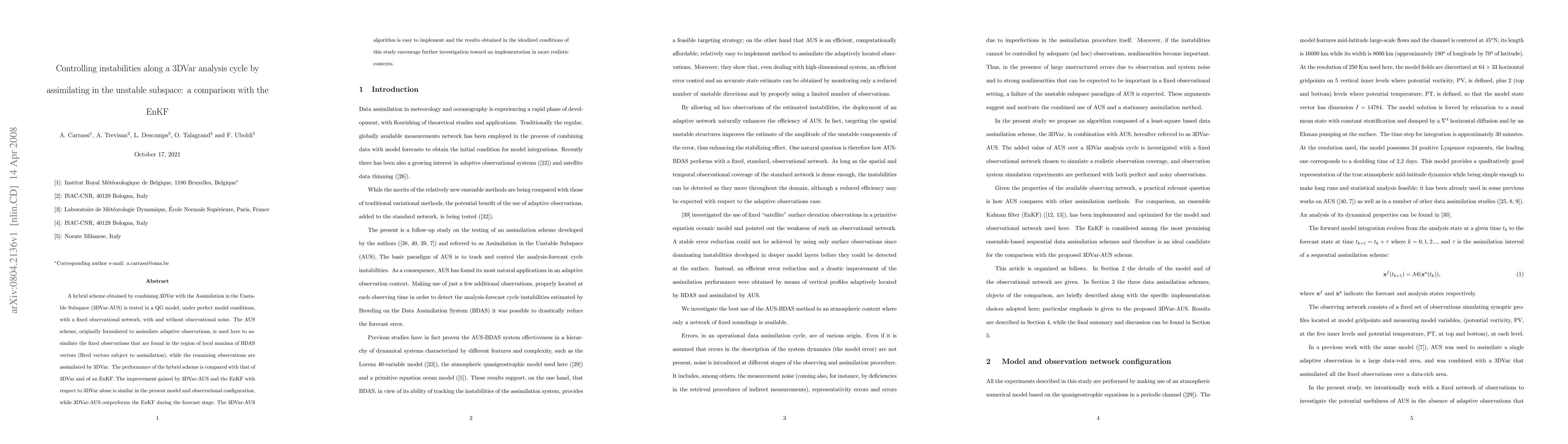 The main technical contribution is the development and testing of a hybrid 3DVar-AUS scheme that targets and controls instabilities in the unstable subspace of the observation-analysis-forecast cycle.