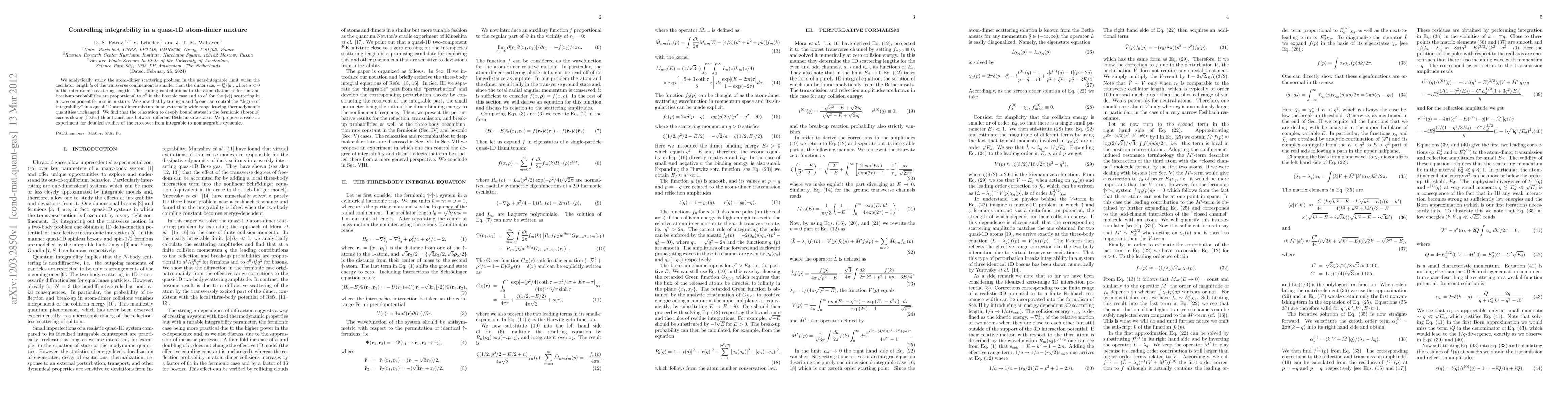 This paper explores the atom-dimer scattering problem in quasi-1D systems, demonstrating how the "degree of integrability" can be controlled by tuning the interatomic scattering length and the transverse confinement length. It finds that thermodynamic properties remain unchanged while the relaxation dynamics vary between fermionic and bosonic mixtures.