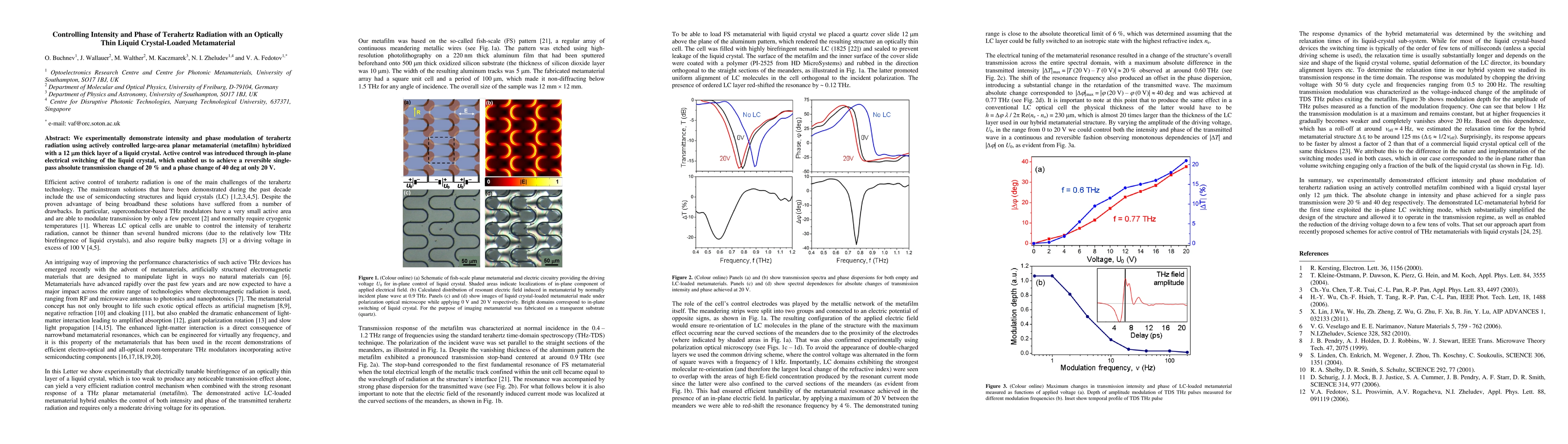 This paper demonstrates the modulation of terahertz radiation's intensity and phase using a metamaterial hybridized with a liquid crystal layer, achieving a 20% transmission change and a 40° phase shift with 20 V electrical control. The study highlights the potential for active control in terahertz applications.
