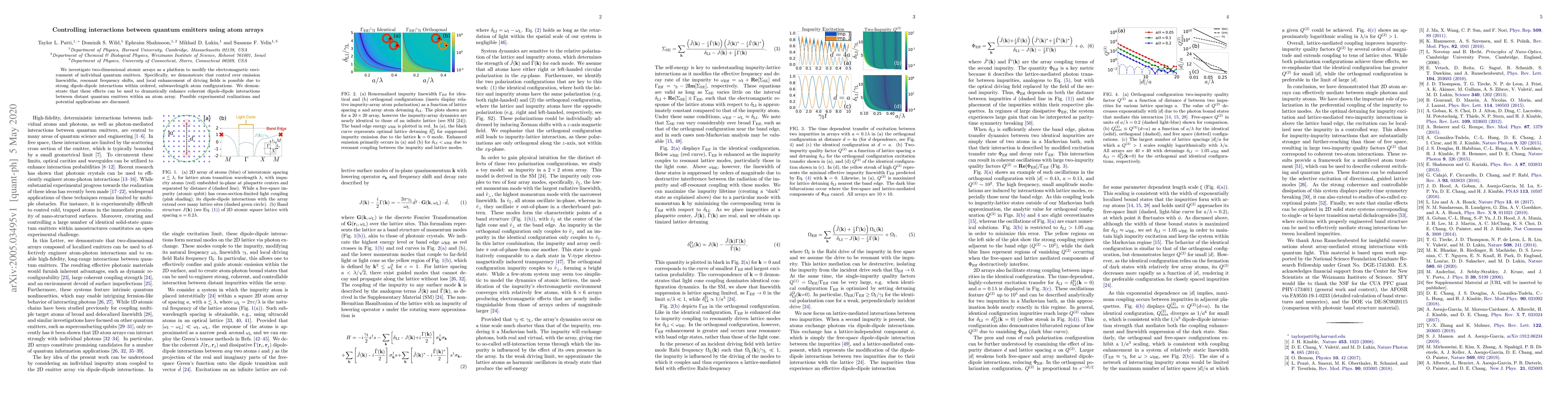 This paper explores the use of two-dimensional atomic arrays to manipulate the electromagnetic environment of quantum emitters, achieving control over emission properties through strong dipole-dipole interactions. The study demonstrates significant enhancements in coherent interactions between distant emitters within the array, with implications for future experimental applications.