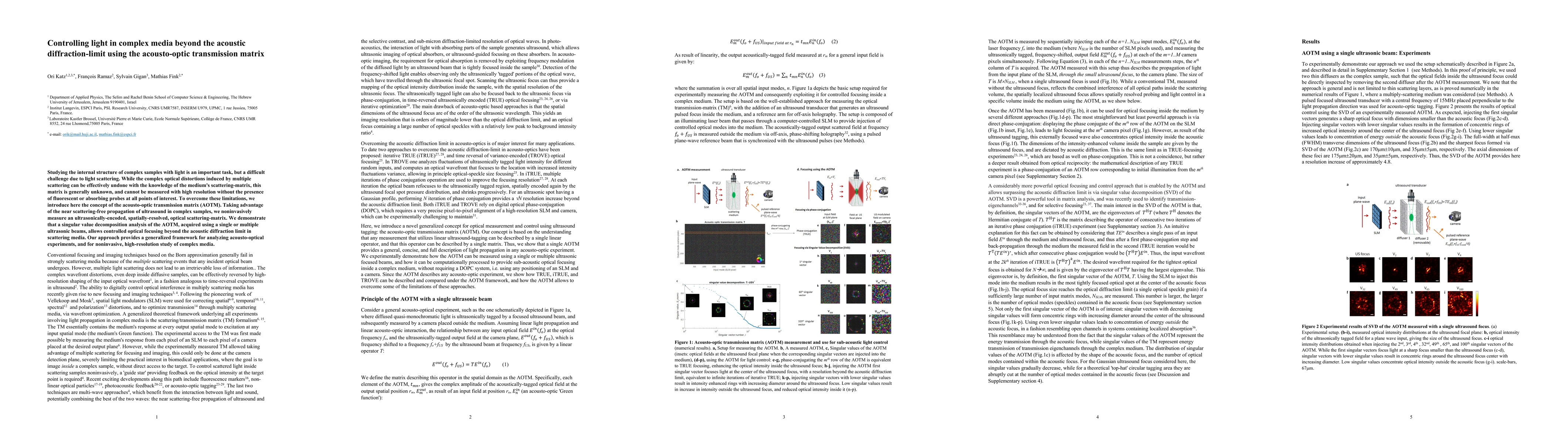 Studying the internal structure of complex samples with light is an important task, but a difficult challenge due to light scattering. While the complex optical distortions induced by multiple scattering can be effectively undone with the knowledge of the medium's scattering-matrix, this matrix is generally unknown, and cannot be measured with high resolution without the presence of fluorescent or absorbing probes at all points of interest. To overcome these limitations, we introduce here the concept of the acousto-optic transmission matrix (AOTM). Taking advantage of the near scattering-free propagation of ultrasound in complex samples, we noninvasively measure an ultrasonically-encoded, spatially-resolved, optical scattering-matrix. We demonstrate that a singular value decomposition analysis of the AOTM, acquired using a single or multiple ultrasonic beams, allows controlled optical focusing beyond the acoustic diffraction limit in scattering media. Our approach provides a generalized framework for analyzing acousto-optical experiments, and for noninvasive, high-resolution study of complex media.