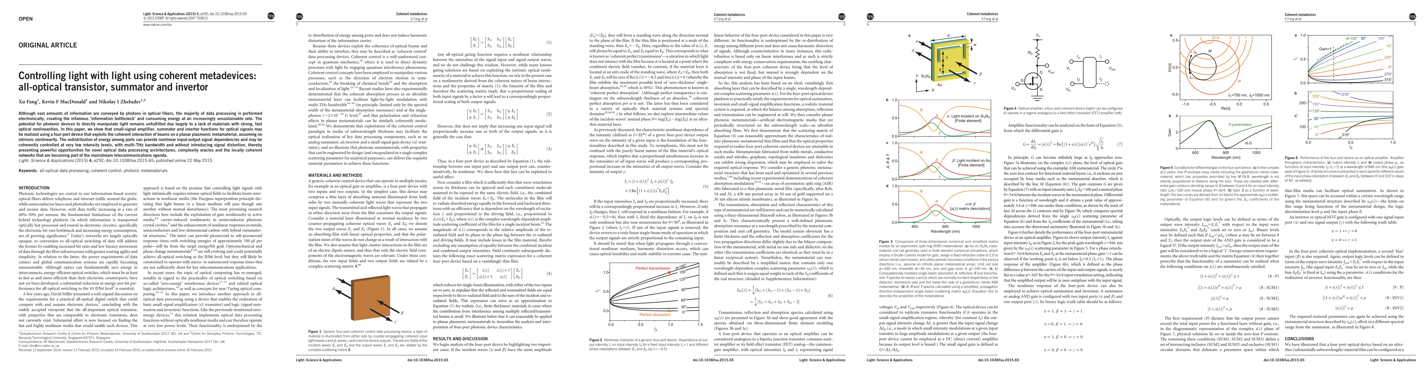 Although vast amounts of information are conveyed by photons in optical fibers, the majority of data processing is performed electronically, creating the infamous 'information bottleneck' and consuming energy at an increasingly unsustainable rate. The potential for photonic devices to directly manipulate light remains unfulfilled due largely to a lack of materials with strong, fast optical nonlinearities. In this paper, we show that small-signal amplifier, summator and invertor functions for optical signals may be realized using a four-port device that exploits the coherent interaction of beams on a planar plasmonic metamaterial, assuming no intrinsic nonlinearity. The redistribution of energy among ports can be coherently controlled at the single photon level, with THz bandwidth and without introducing signal distortion, thereby presenting powerful opportunities for novel optical data processing architectures, complexity oracles and the locally coherent networks that are becoming part of the mainstream telecommunications agenda.
