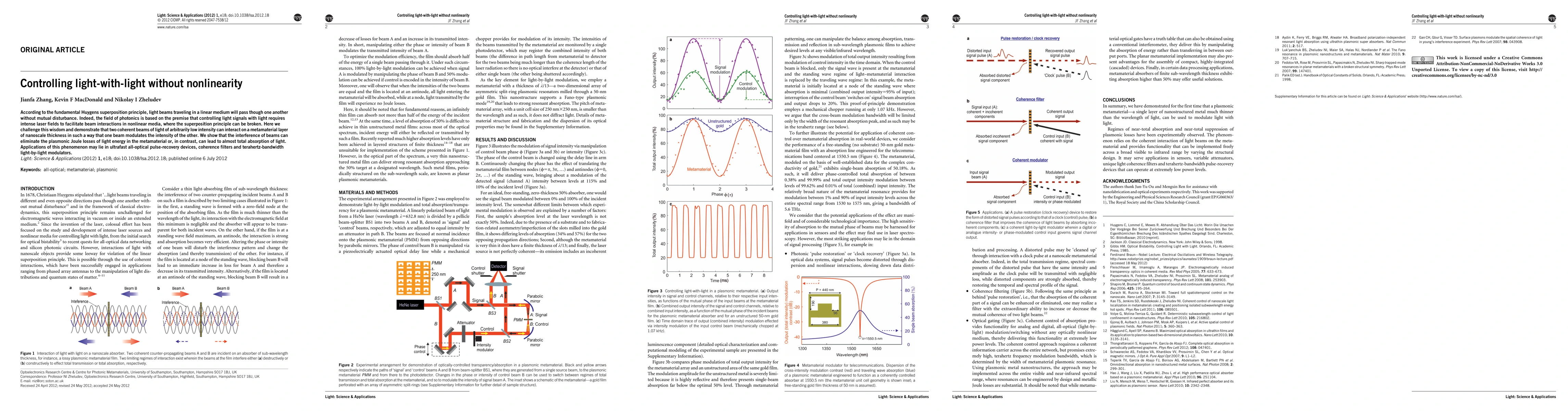 This paper demonstrates that low-intensity light beams can interact and modulate each other's intensity via a nanoscale metamaterial layer, defying the conventional need for nonlinear media. Potential applications include ultrafast all-optical devices, coherence filters, and THz-bandwidth light-by-light modulators.