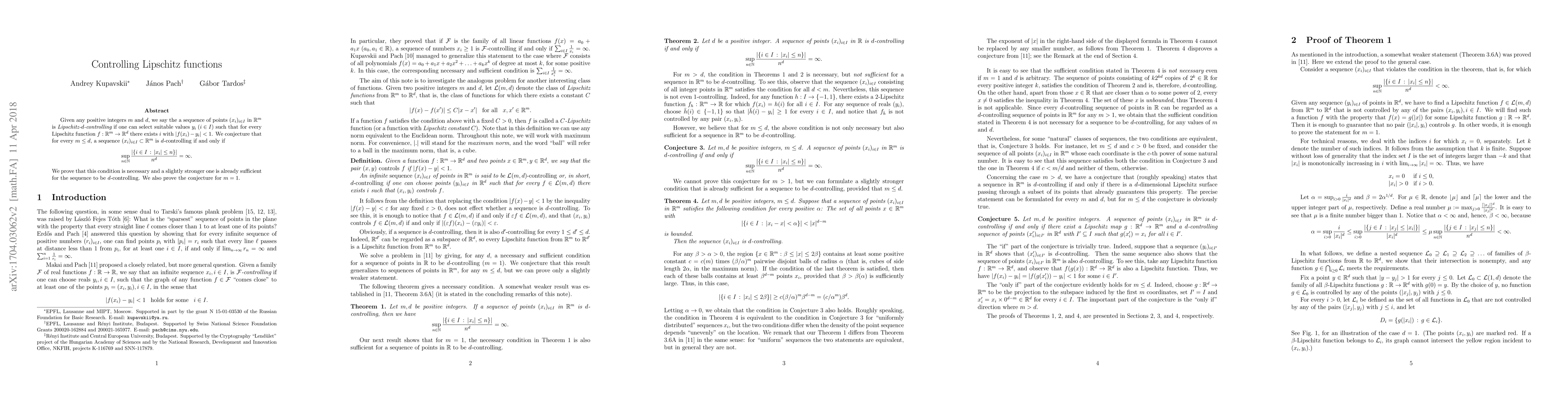 Researchers investigate sequences of points in multi-dimensional space that can control Lipschitz functions, finding a necessary condition for d-controlling sequences and proving the conjecture for m=1.