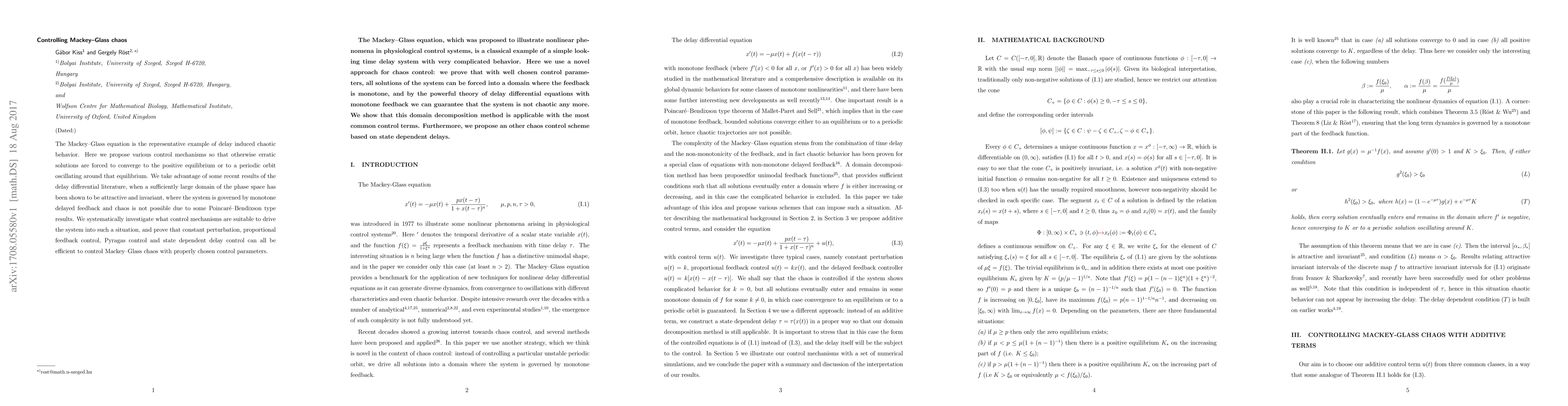The Mackey--Glass equation, which was proposed to illustrate nonlinear phenomena in physiological control systems, is a classical example of a simple looking time delay system with very complicated behavior. Here we use a novel approach for chaos control: we prove that with well chosen control parameters, all solutions of the system can be forced into a domain where the feedback is monotone, and by the powerful theory of delay differential equations with monotone feedback we can guarantee that the system is not chaotic any more. We show that this domain decomposition method is applicable with the most common control terms. Furthermore, we propose an other chaos control scheme based on state dependent delays.