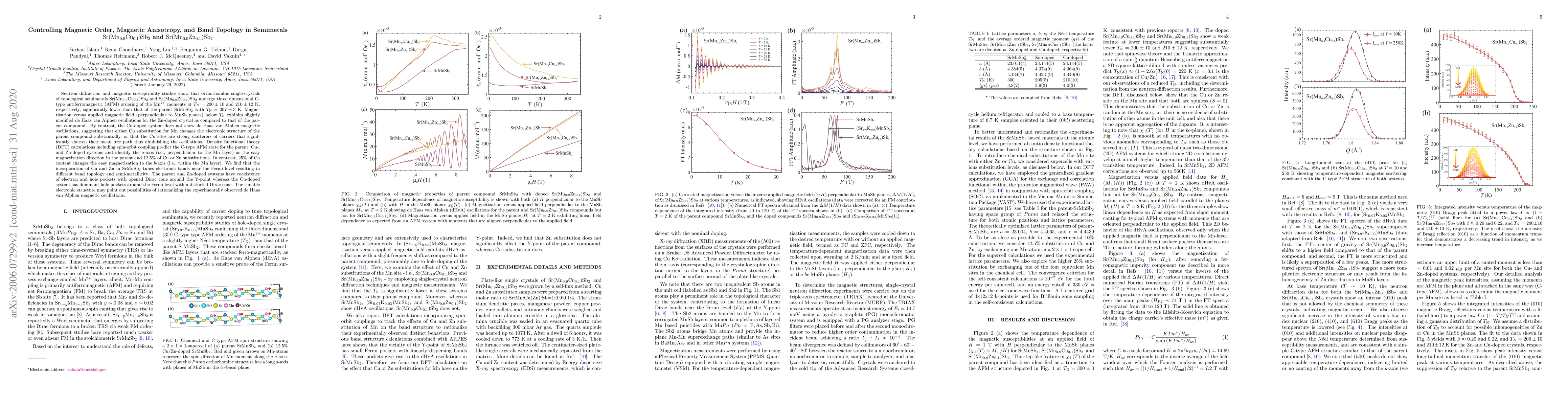 Neutron diffraction and magnetic susceptibility studies show that orthorhombic single-crystals of topological semimetals ${\rm Sr(Mn_{0.9}Cu_{0.1})Sb_2}$ and ${\rm Sr(Mn_{0.9}Zn_{0.1})Sb_2}$ undergo three dimensional C-type antiferromagnetic (AFM) ordering of the Mn$^{2+}$ moments at $T_N = 200\pm10$ and $210\pm12$ K, respectively, significantly lower than that of the parent SrMnSb$_2$ with $T_N=297 \pm 3$ K. Magnetization versus applied magnetic field (perpendicular to MnSb planes) below $T_N$ exhibits slightly modified de Haas van Alphen oscillations for the Zn-doped crystal as compared to that of the parent compound. By contrast, the Cu-doped system does not show de Haas van Alphen magnetic oscillations, suggesting that either Cu substitution for Mn changes the electronic structure of the parent compound substantially, or that the Cu sites are strong scatterers of carriers that significantly shorten their mean free path thus diminishing the oscillations. Density functional theory (DFT) calculations including spin-orbit coupling predict the C-type AFM state for the parent, Cu-, and Zn-doped systems and identify the $a$-axis (i.e., perpendicular to the Mn layer) as the easy magnetization direction in the parent and 12.5% of Cu or Zn substitutions. In contrast, 25% of Cu content changes the easy magnetization to the $b$-axis (i.e., within the Mn layer). We find that the incorporation of Cu and Zn in SrMnSb$_2$ tunes electronic bands near the Fermi level resulting in different band topology and semi-metallicity. The parent and Zn-doped systems have coexistence of electron and hole pockets with opened Dirac cone around the Y-point whereas the Cu-doped system has dominant hole pockets around the Fermi level with a distorted Dirac cone. The tunable electronic structure may point out possibilities of rationalizing the experimentally observed de Haas van Alphen magnetic oscillations.