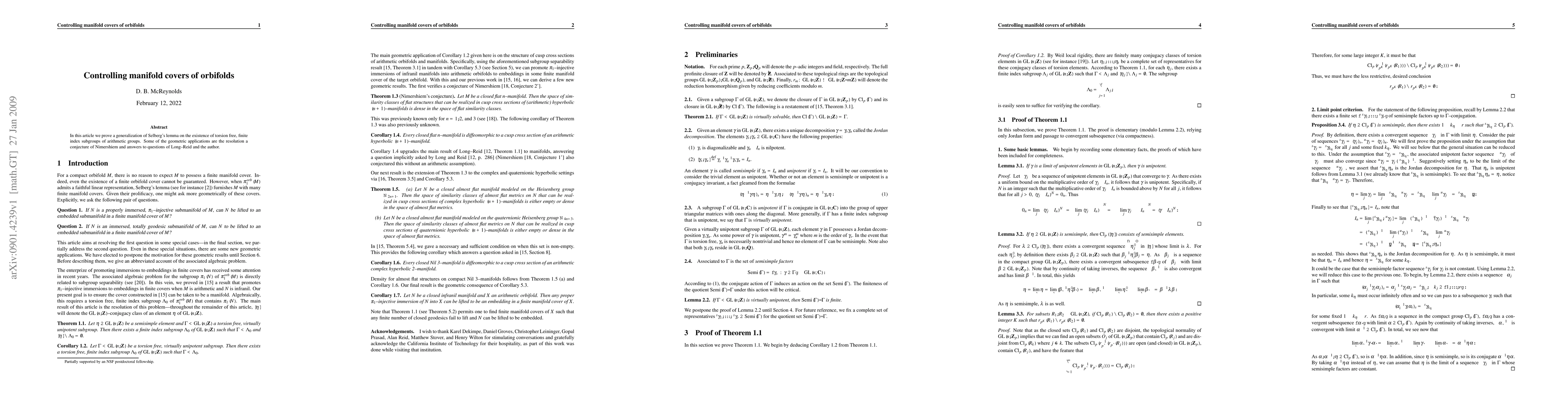 In this article we prove a generalization of Selberg's lemma on the existence of torsion free, finite index subgroups of arithmetic groups. Some of the geometric applications are the resolution a conjecture of Nimershiem and answers to questions of Long-Reid and the author.