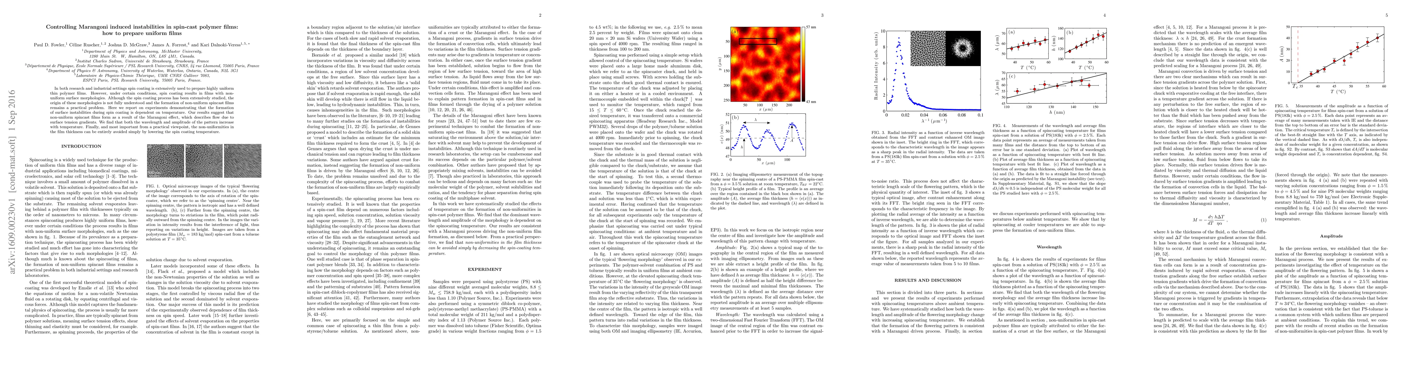 In both research and industrial settings spin coating is extensively used to prepare highly uniform thin polymer films. However, under certain conditions, spin coating results in films with non-uniform surface morphologies. Although the spin coating process has been extensively studied, the origin of these morphologies is not fully understood and the formation of non-uniform spincast films remains a practical problem. Here we report on experiments demonstrating that the formation of surface instabilities during spin coating is dependent on temperature. Our results suggest that non-uniform spincast films form as a result of the Marangoni effect, which describes flow due to surface tension gradients. We find that both the wavelength and amplitude of the pattern increase with temperature. Finally, and most important from a practical viewpoint, the non-uniformities in the film thickness can be entirely avoided simply by lowering the spin coating temperature.