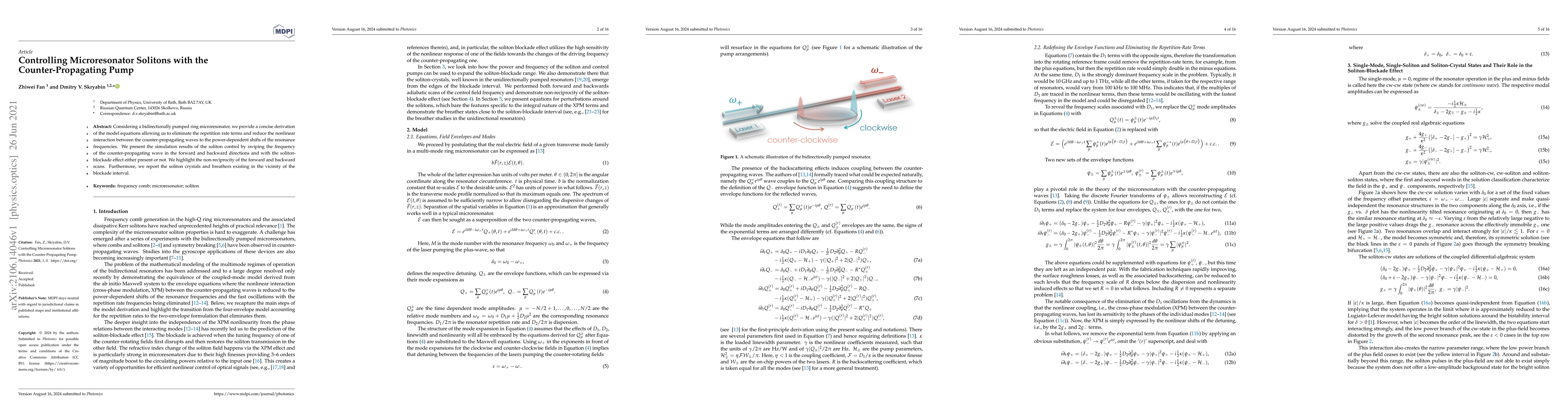 This paper derives model equations for bidirectionally pumped ring microresonators, demonstrating soliton control via frequency manipulation of counter-propagating waves. It highlights non-reciprocal soliton behavior and identifies soliton crystals and breathers near the soliton-blockade interval.