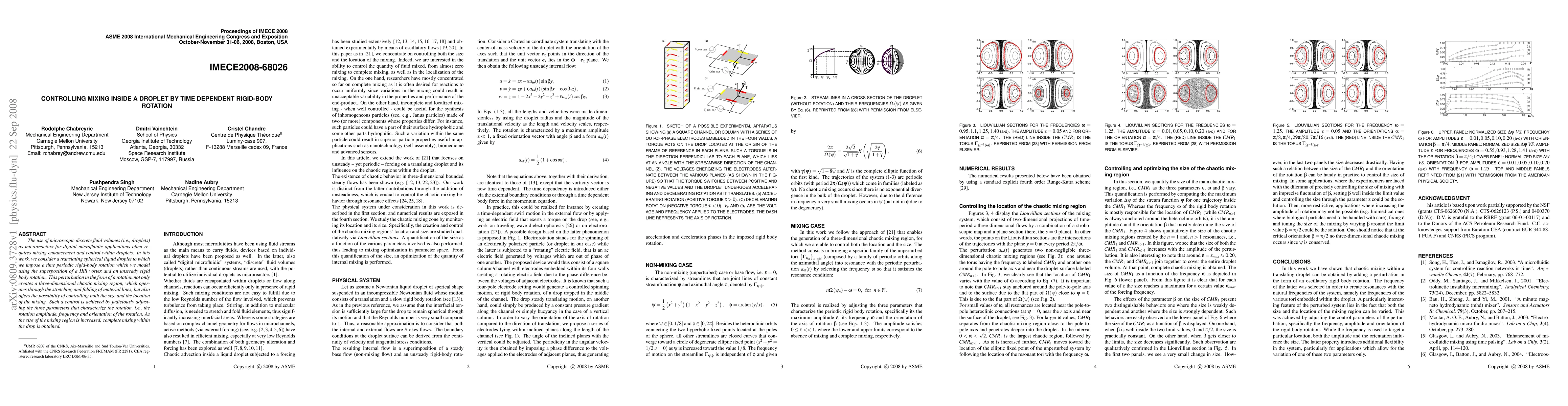 This paper explores the enhancement and control of mixing inside a translating spherical liquid droplet through time-dependent rigid-body rotation, achieving three-dimensional chaotic mixing and enabling precise control over the size and location of the mixing region by adjusting rotation parameters.