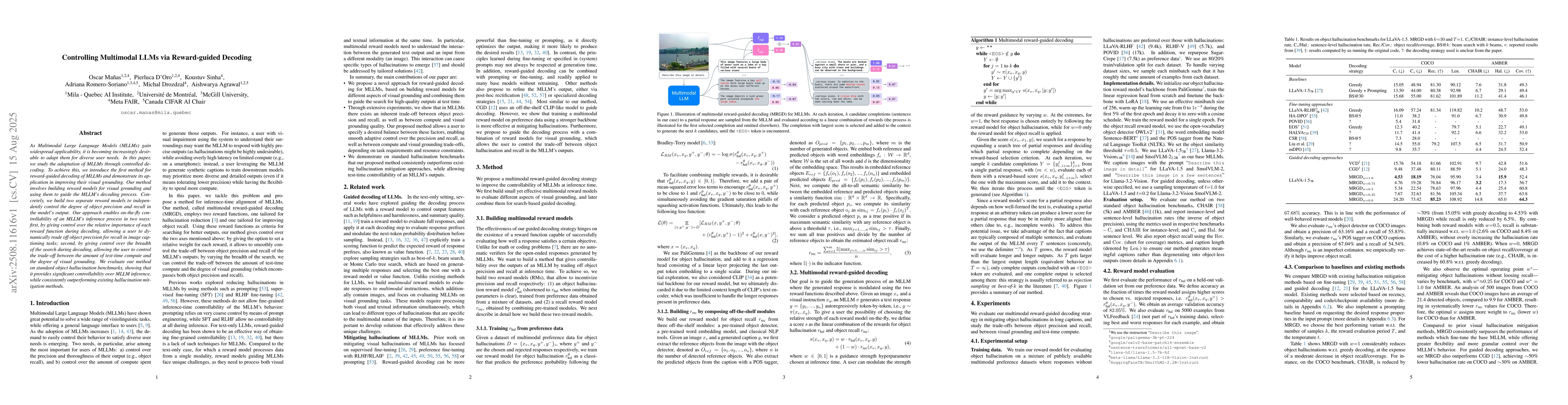 As Multimodal Large Language Models (MLLMs) gain widespread applicability, it is becoming increasingly desirable to adapt them for diverse user needs. In this paper, we study the adaptation of MLLMs through controlled decoding. To achieve this, we introduce the first method for reward-guided decoding of MLLMs and demonstrate its application in improving their visual grounding. Our method involves building reward models for visual grounding and using them to guide the MLLM's decoding process. Concretely, we build two separate reward models to independently control the degree of object precision and recall in the model's output. Our approach enables on-the-fly controllability of an MLLM's inference process in two ways: first, by giving control over the relative importance of each reward function during decoding, allowing a user to dynamically trade off object precision for recall in image captioning tasks; second, by giving control over the breadth of the search during decoding, allowing the user to control the trade-off between the amount of test-time compute and the degree of visual grounding. We evaluate our method on standard object hallucination benchmarks, showing that it provides significant controllability over MLLM inference, while consistently outperforming existing hallucination mitigation methods.
