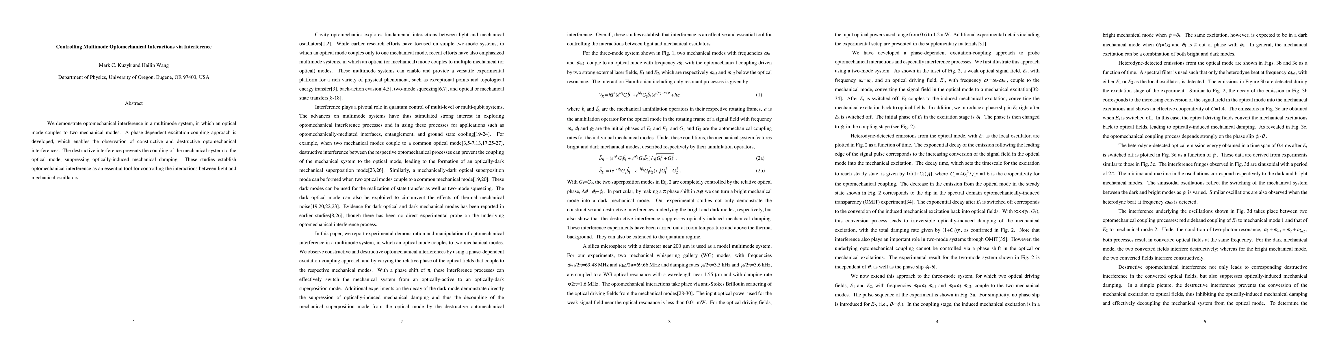 This paper demonstrates optomechanical interference in a multimode system where an optical mode interacts with two mechanical modes, using a phase-dependent excitation-coupling approach. Destructive interference is shown to suppress optically-induced mechanical damping, establishing interference as a key tool for controlling light-mechanical interactions.