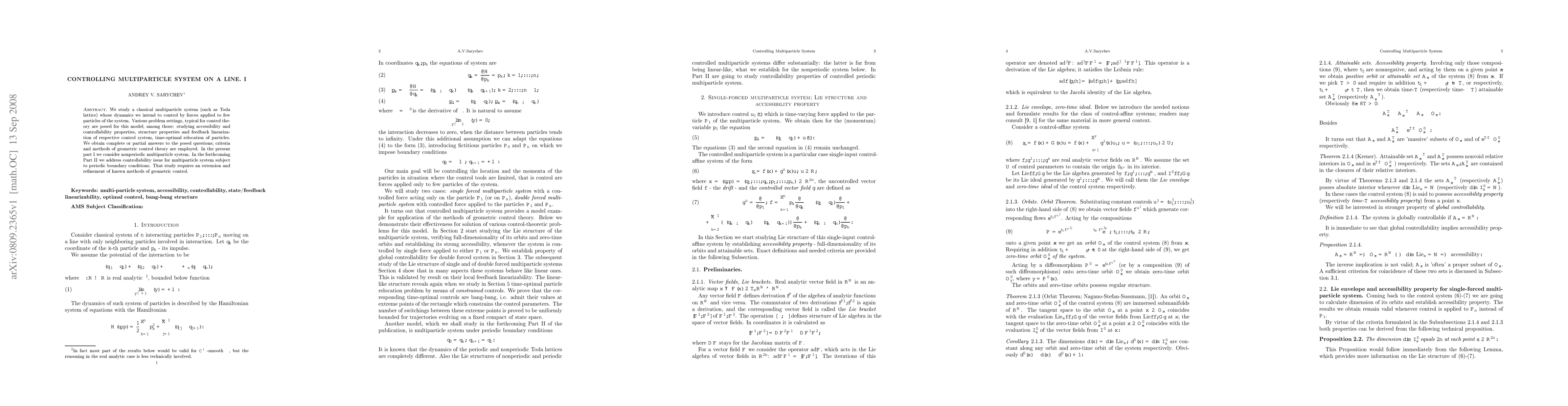 We study a classical multiparticle system (such as Toda lattice) whose dynamics we intend to control by forces applied to few particles of the system. Various problem settings, typical for control theory are posed for this model; among those: studying accessibility and controllability properties, structure properties and feedback linearization of respective control system, time-optimal relocation of particles. We obtain complete or partial answers to the posed questions; criteria and methods of geometric control theory are employed. In the present part I we consider nonperiodic multiparticle system. In the forthcoming Part II we address controllability issue for multiparticle system subject to periodic boundary conditions. That study would require an extension and refinement of known methods of geometric control.