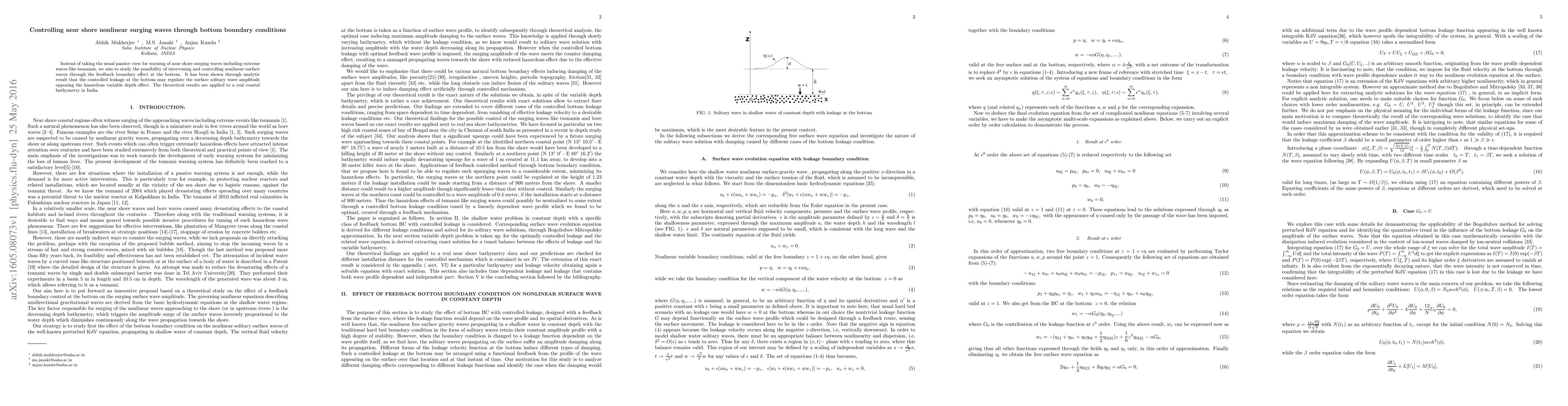 This paper explores the control of nonlinear surging waves near the shore by manipulating bottom boundary conditions, demonstrating that regulated leakage at the seabed can mitigate wave amplitude, countering the adverse effects of variable depth. Theoretical results are validated through application to a coastal region in India.