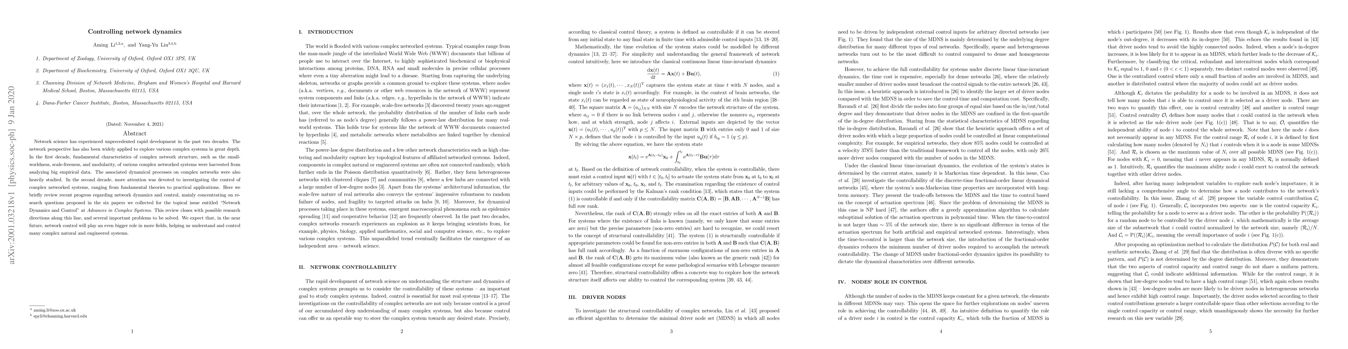 Network science has experienced unprecedented rapid development in the past two decades. The network perspective has also been widely applied to explore various complex systems in great depth. In the first decade, fundamental characteristics of complex network structure, such as the small-worldness, scale-freeness, and modularity, of various complex networked systems were harvested from analyzing big empirical data. The associated dynamical processes on complex networks were also heavily studied. In the second decade, more attention was devoted to investigating the control of complex networked systems, ranging from fundamental theories to practical applications. Here we briefly review recent progress regarding network dynamics and control, mainly concentrating on research questions proposed in the six papers we collected for the topical issue entitled "Network Dynamics and Control" at $Advances~in~Complex~Systems$. This review closes with possible research directions along this line, and several important problems to be solved. We expect that, in the near future, network control will play an even bigger role in more fields, helping us understand and control many complex natural and engineered systems.