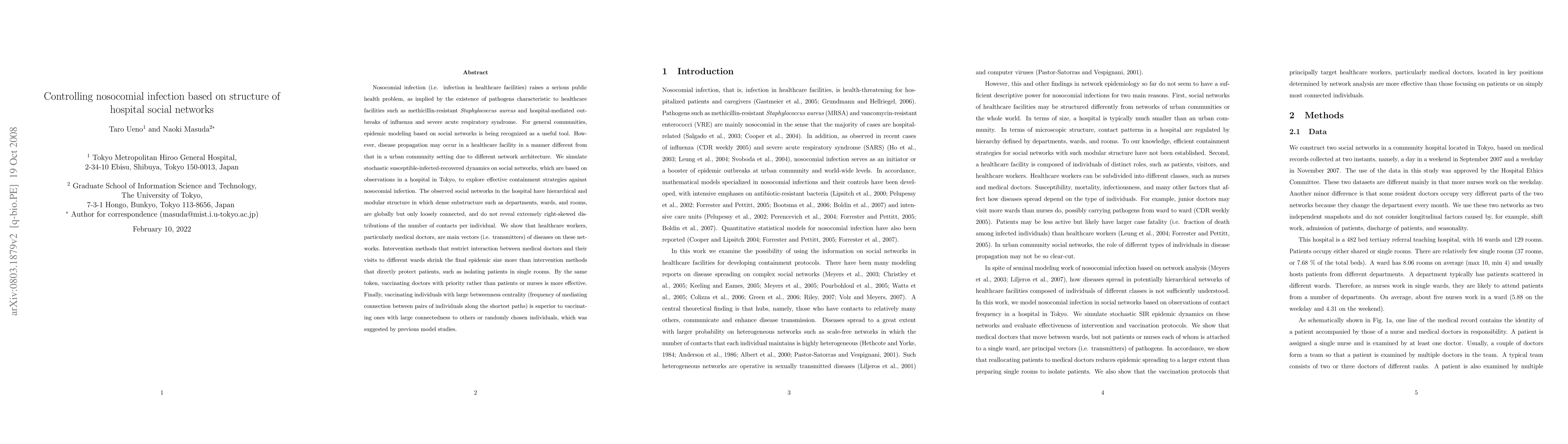 This paper investigates nosocomial infection control strategies using hospital social network structures. It finds that interventions targeting interactions among medical doctors and their ward visits are more effective than those protecting patients, with priority vaccination for doctors also proving superior. The study highlights the importance of individuals with high betweenness centrality in infection control.