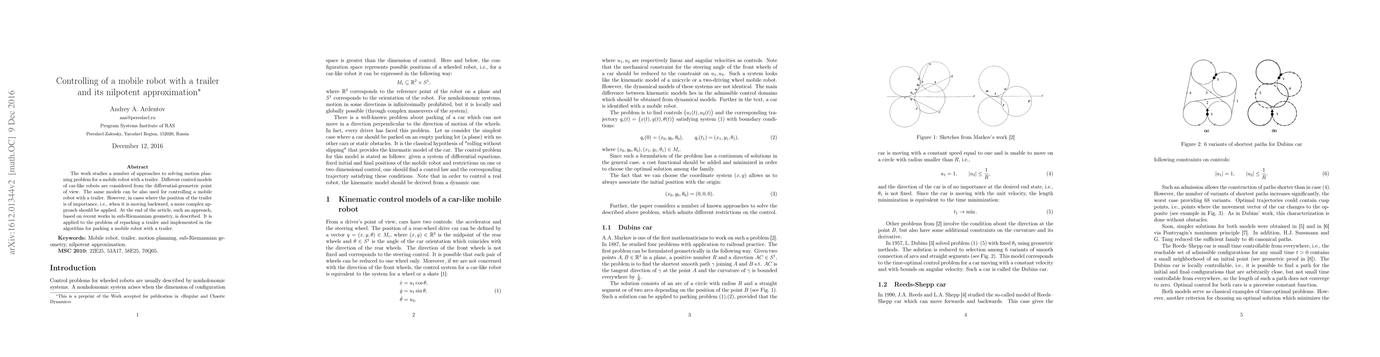 This paper presents a method for controlling a mobile robot with a trailer using differential-geometric approaches and sub-Riemannian geometry, enabling the robot to repark itself while considering the trailer's position.
