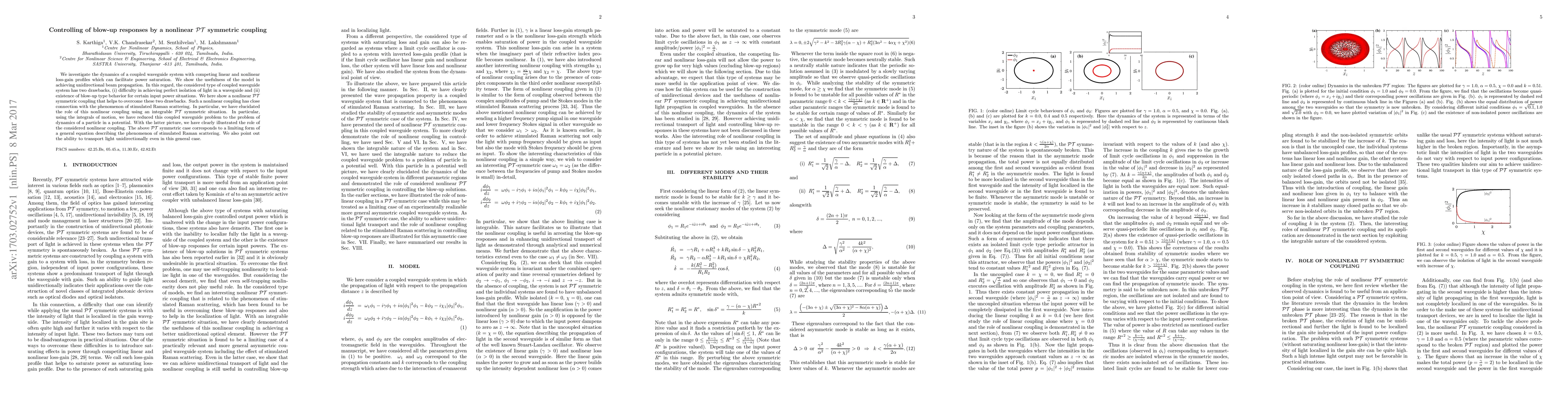 This paper explores the dynamics of a coupled waveguide system with nonlinear $\cal{PT}$ symmetric coupling to manage power saturation and unidirectional beam propagation. The study demonstrates how this coupling can mitigate issues of imperfect isolation and blow-up behavior, leveraging the phenomenon of stimulated Raman scattering.