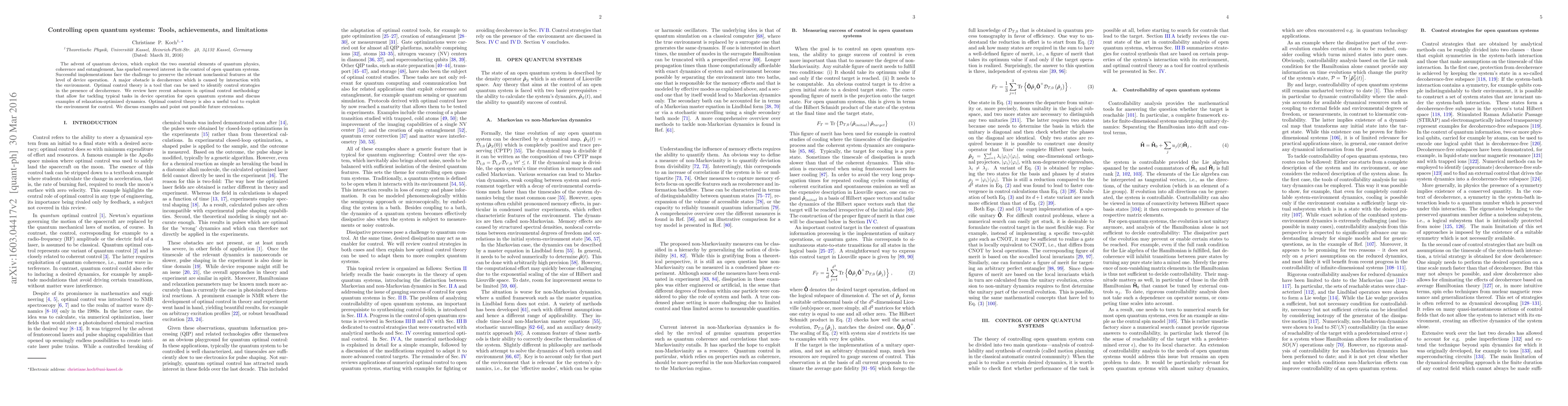 The advent of quantum devices, which exploit the two essential elements of quantum physics, coherence and entanglement, has sparked renewed interest in the control of open quantum systems. Successful implementations face the challenge to preserve the relevant nonclassical features at the level of device operation. A major obstacle is decoherence which is caused by interaction with the environment. Optimal control theory is a tool that can be used to identify control strategies in the presence of decoherence. We review here recent advances in optimal control methodology that allow for tackling typical tasks in device operation for open quantum systems and discuss examples of relaxation-optimized dynamics. Optimal control theory is also a useful tool to exploit the environment for control. We discuss examples and point out possible future extensions.
