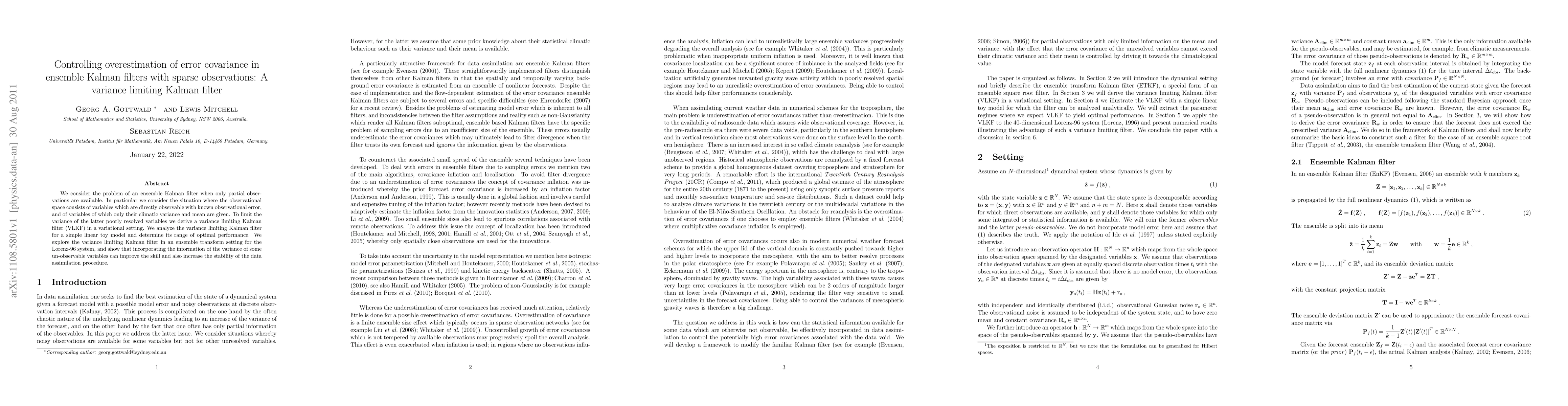 This paper proposes a variance limiting Kalman filter (VLKF) to address overestimation of error covariance in ensemble Kalman filters when sparse observations are available. The VLKF is applied to a simple linear toy model and the Lorenz-96 system, demonstrating improved data assimilation skill and stability by incorporating variance information of unobservable variables.