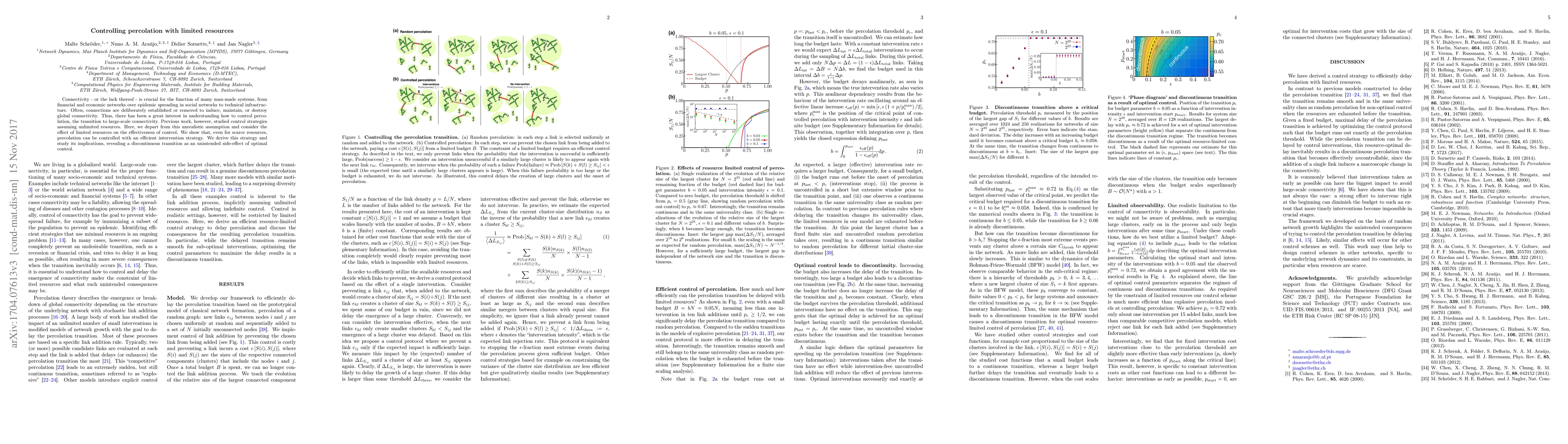 This paper investigates control strategies for managing percolation in networks under limited resource constraints, demonstrating that effective control can still be achieved with an efficient intervention strategy. It reveals a discontinuous transition as a side-effect of optimal control, highlighting the complexities of resource-limited percolation management.