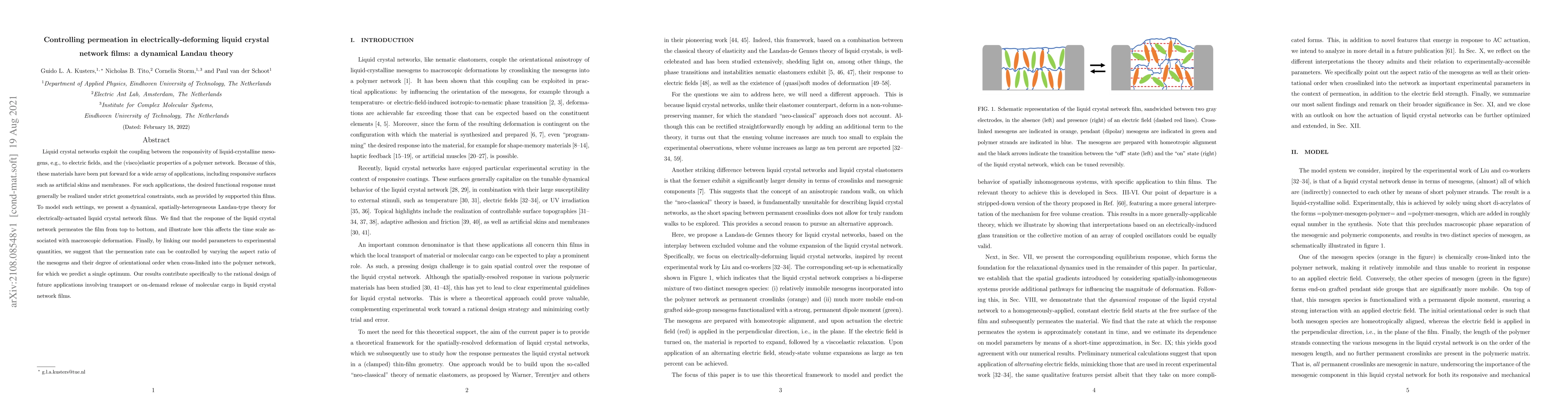 This paper develops a dynamical Landau theory to model the electrically-induced deformation in liquid crystal network films, showing how the permeation response affects macroscopic deformation time scales. It proposes that controlling the aspect ratio and orientational order of mesogens in the network can optimize permeation rates for applications like responsive surfaces and on-demand molecular cargo release.