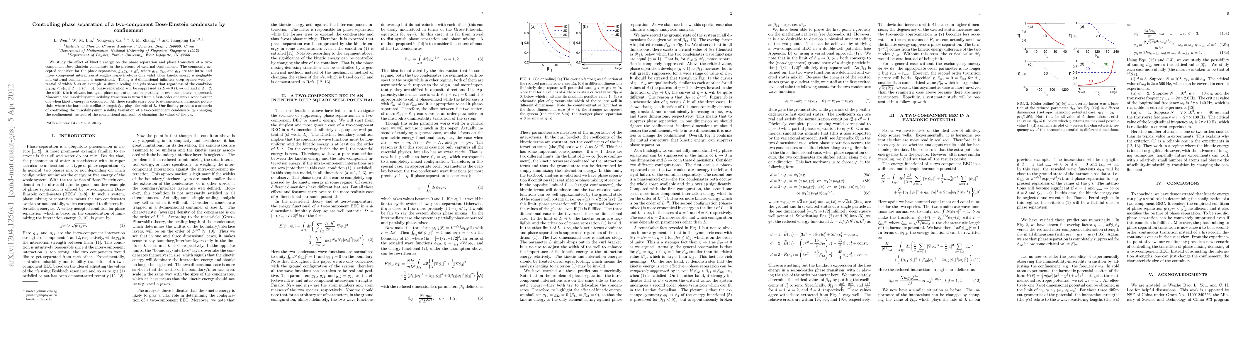 This paper demonstrates that the phase separation in a two-component Bose-Einstein condensate is influenced not only by interaction strengths but also by kinetic energy and confinement. It shows that confinement can suppress phase separation even when traditional interaction conditions suggest otherwise.