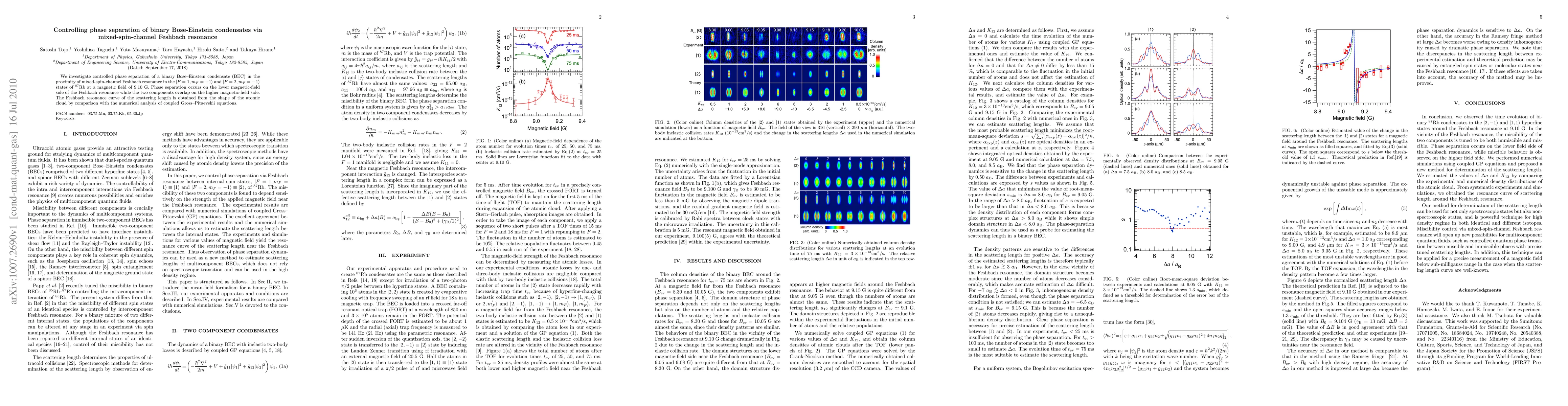 This paper explores the controlled phase separation of a binary Bose-Einstein condensate (BEC) near mixed-spin-channel Feshbach resonance in 87Rb atoms, demonstrating that the condensate components separate at lower magnetic fields and overlap at higher fields. The resonance curve is determined by analyzing the cloud's shape and comparing it with numerical solutions of the coupled Gross-Pitaevskii equations.