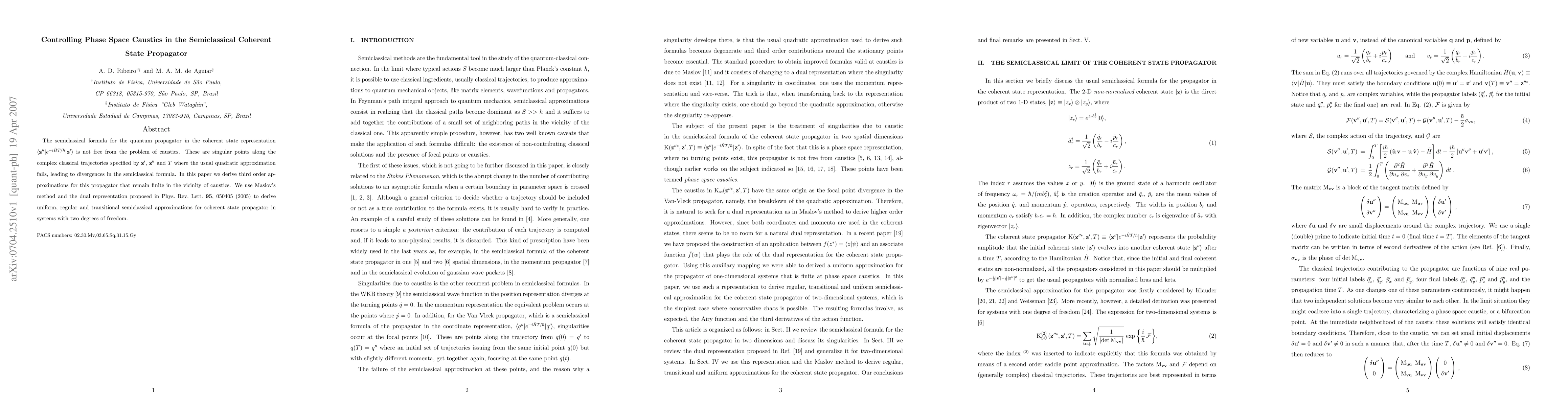 This paper addresses the issue of caustics in the semiclassical coherent state propagator, deriving third-order approximations to maintain finiteness near singular points. It employs Maslov's method and dual representation to achieve uniform, regular, and transitional semiclassical approximations for systems with two degrees of freedom.